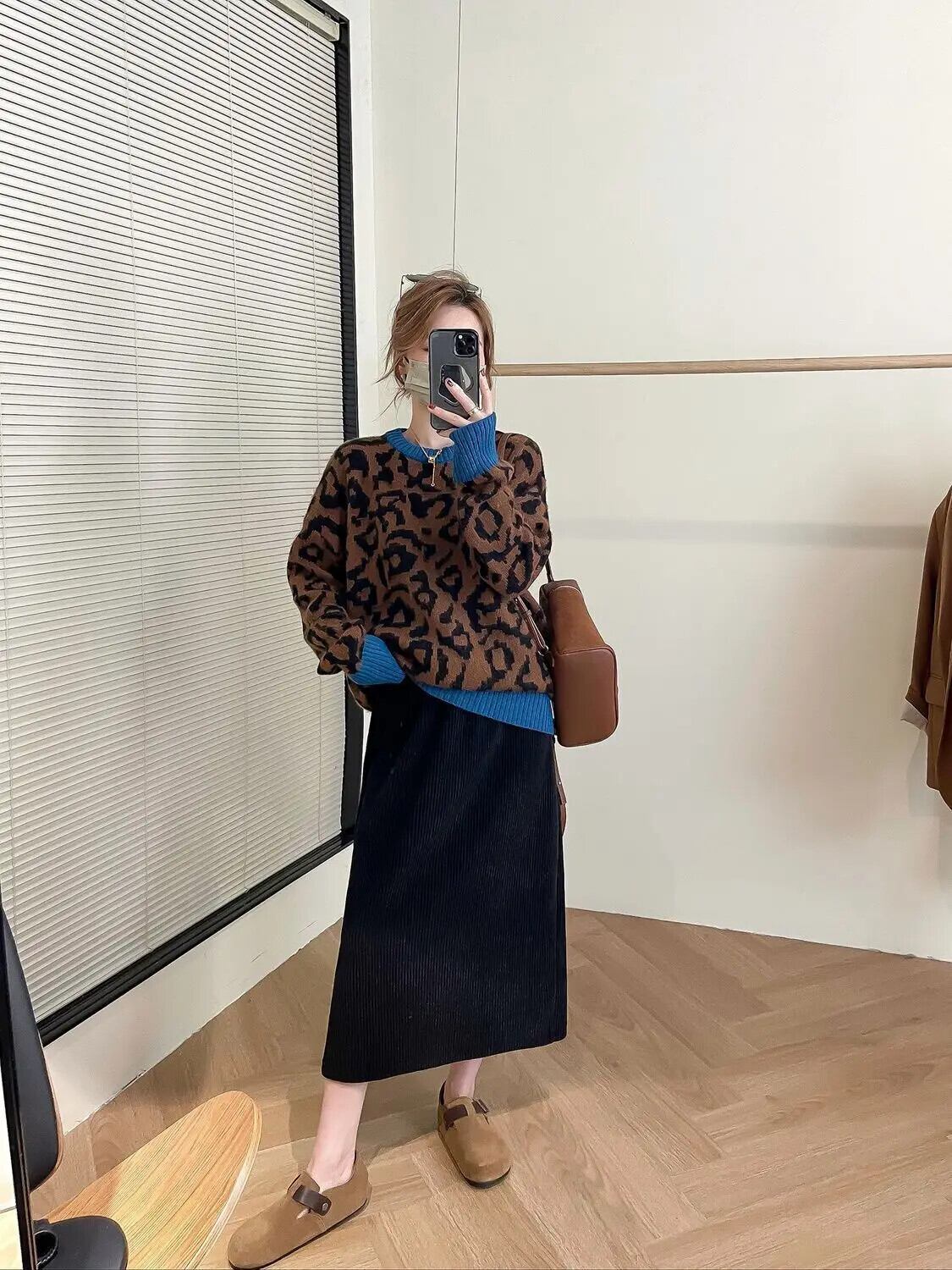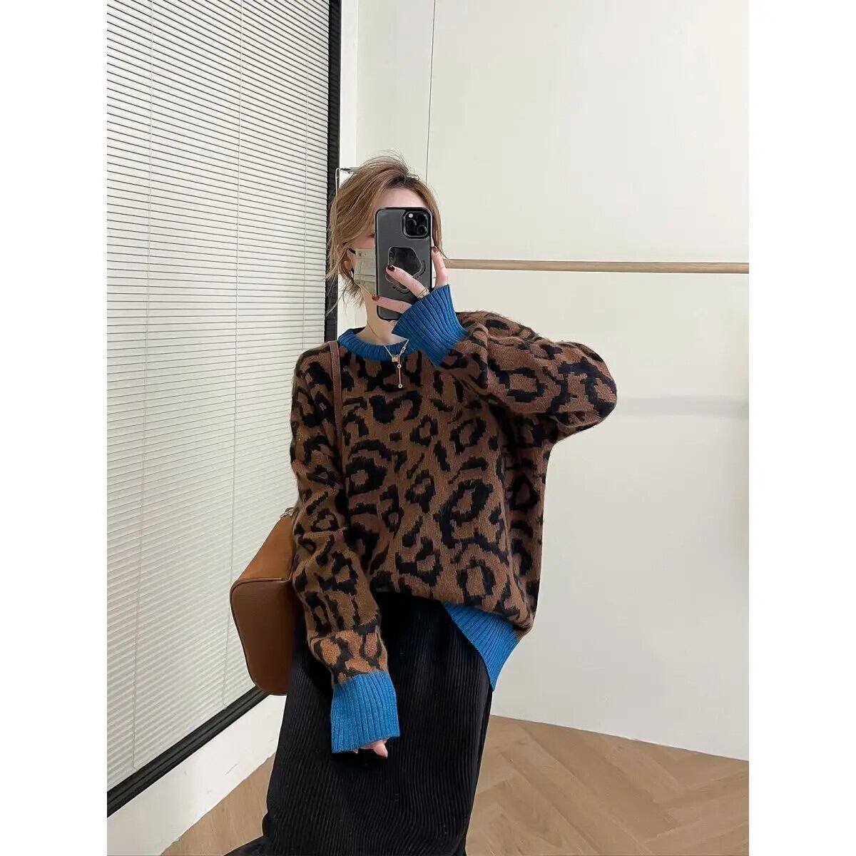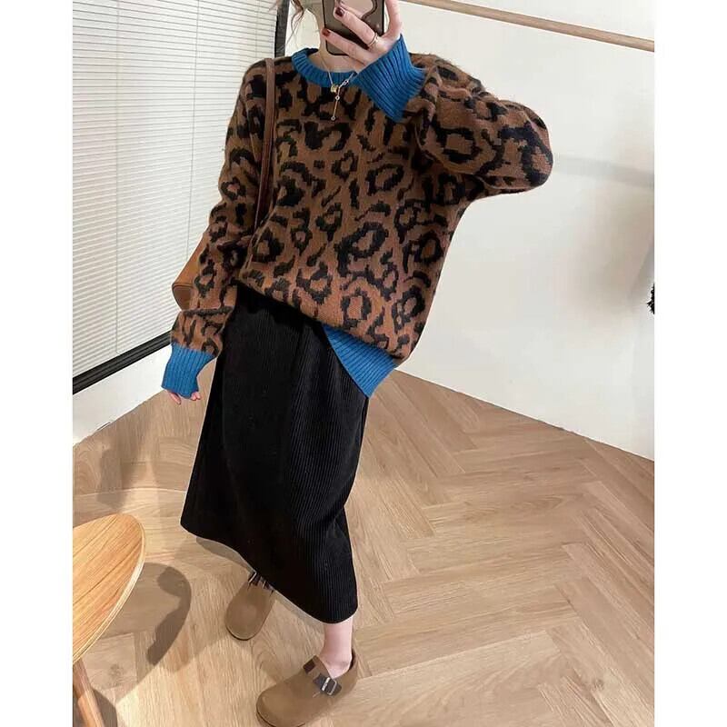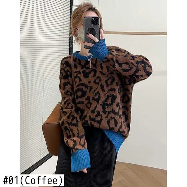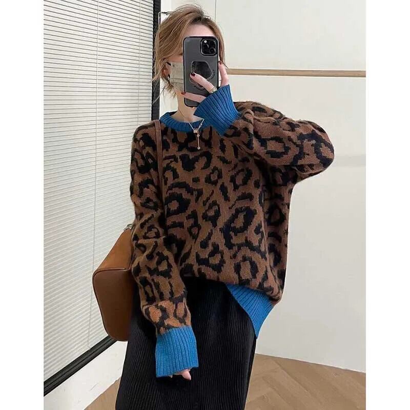 送料無料 O ネックスプライシングルーズヒョウセーター女性の 2023 冬特大通勤プルオーバーニットトップス ウィンター 冬物 Oネック AE1288776673707711938
