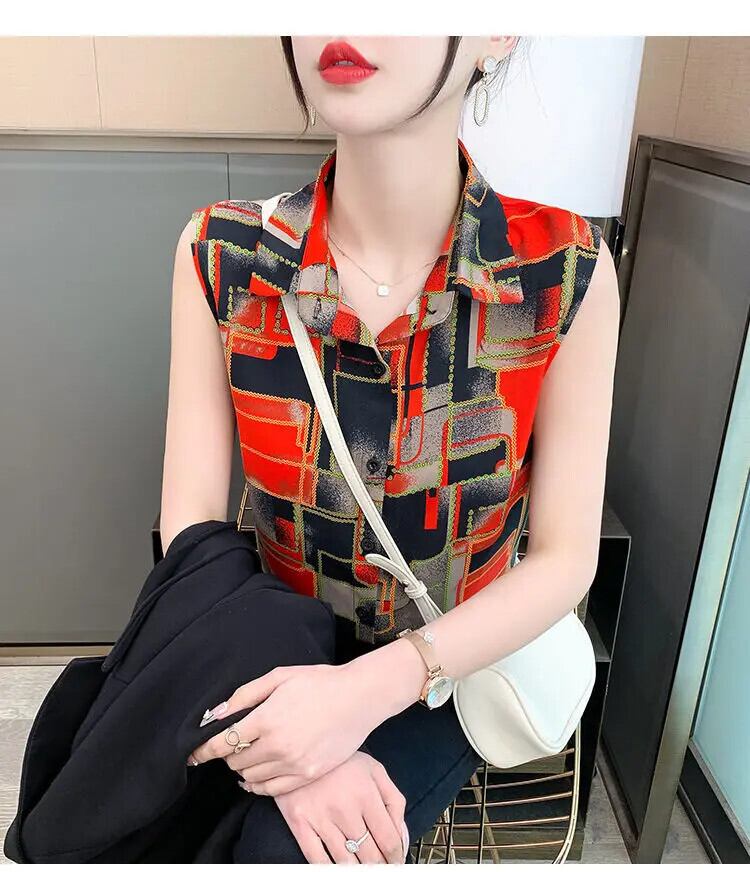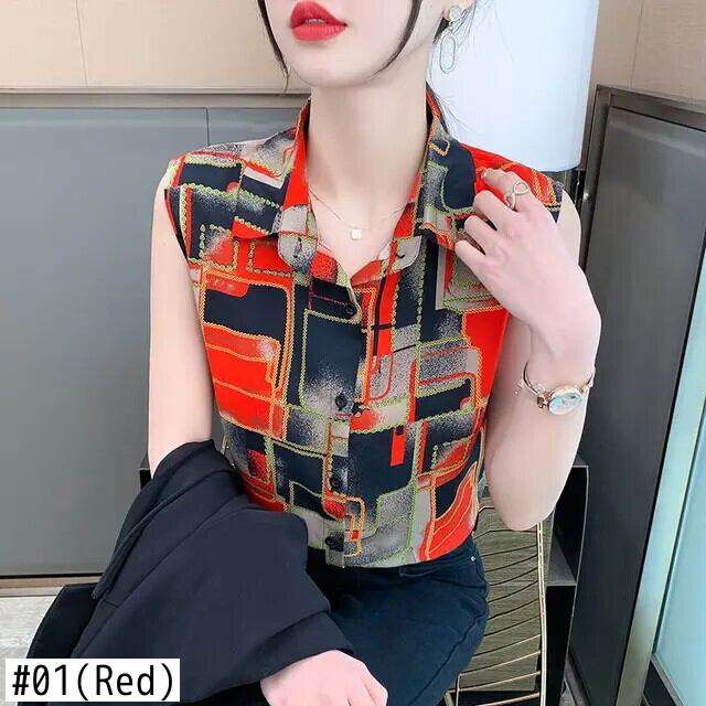 送料無料 ヴィンテージプリントスプライスボタンタイダイノースリーブシフォンシャツ女性の 2023 夏トップス通勤ブラウス サマー 夏物 ビンテージ AE1288776630038968121