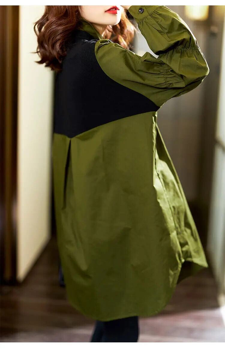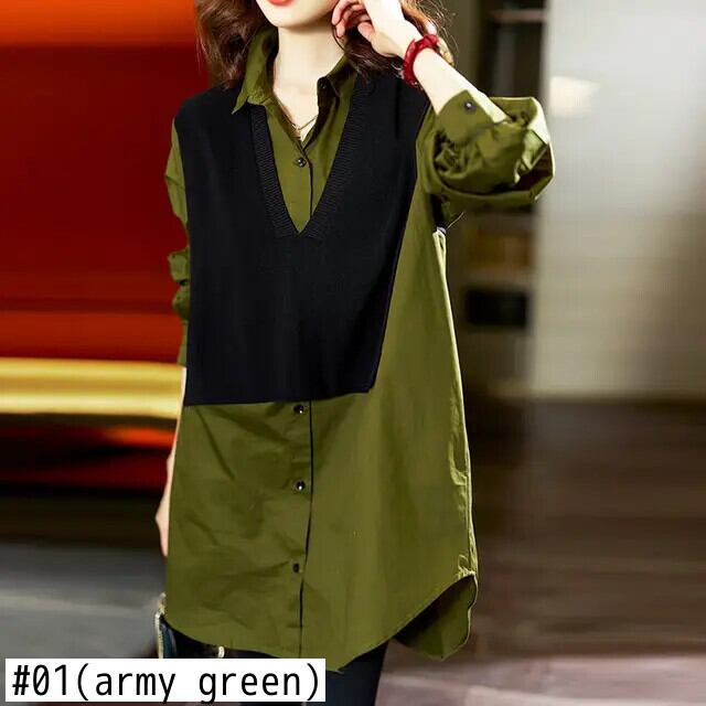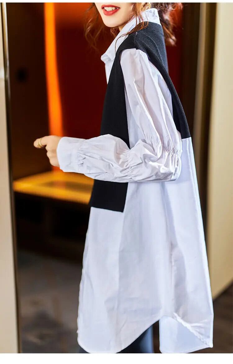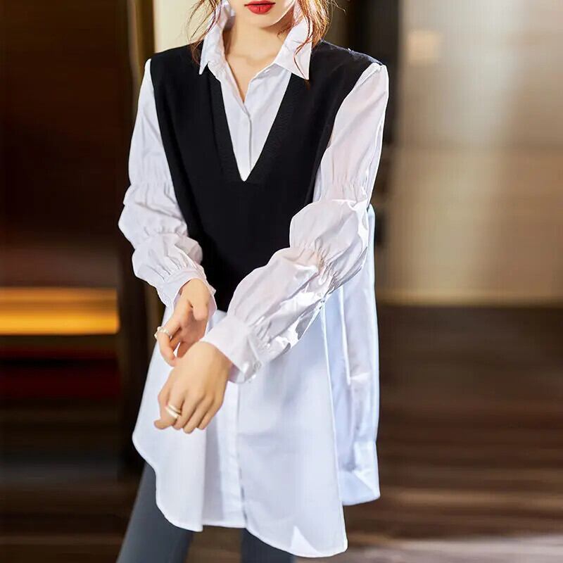 送料無料 ランタンスリーブボタンスプライス折り偽二枚ブラウス女性 2022 秋トップスルーズシャツ オータム 秋物 AE1288776655060980460