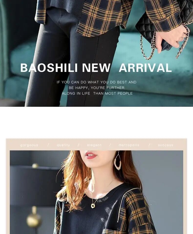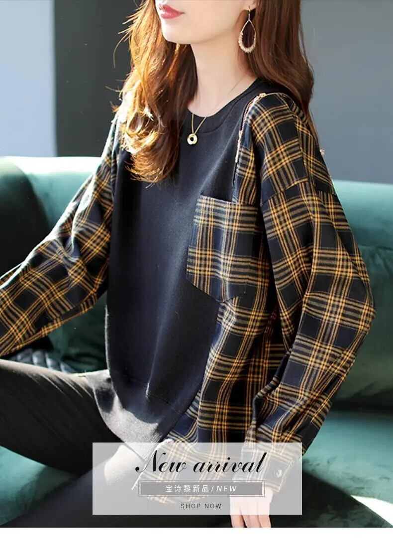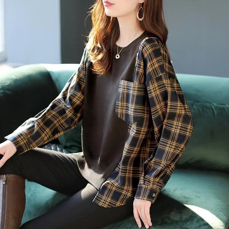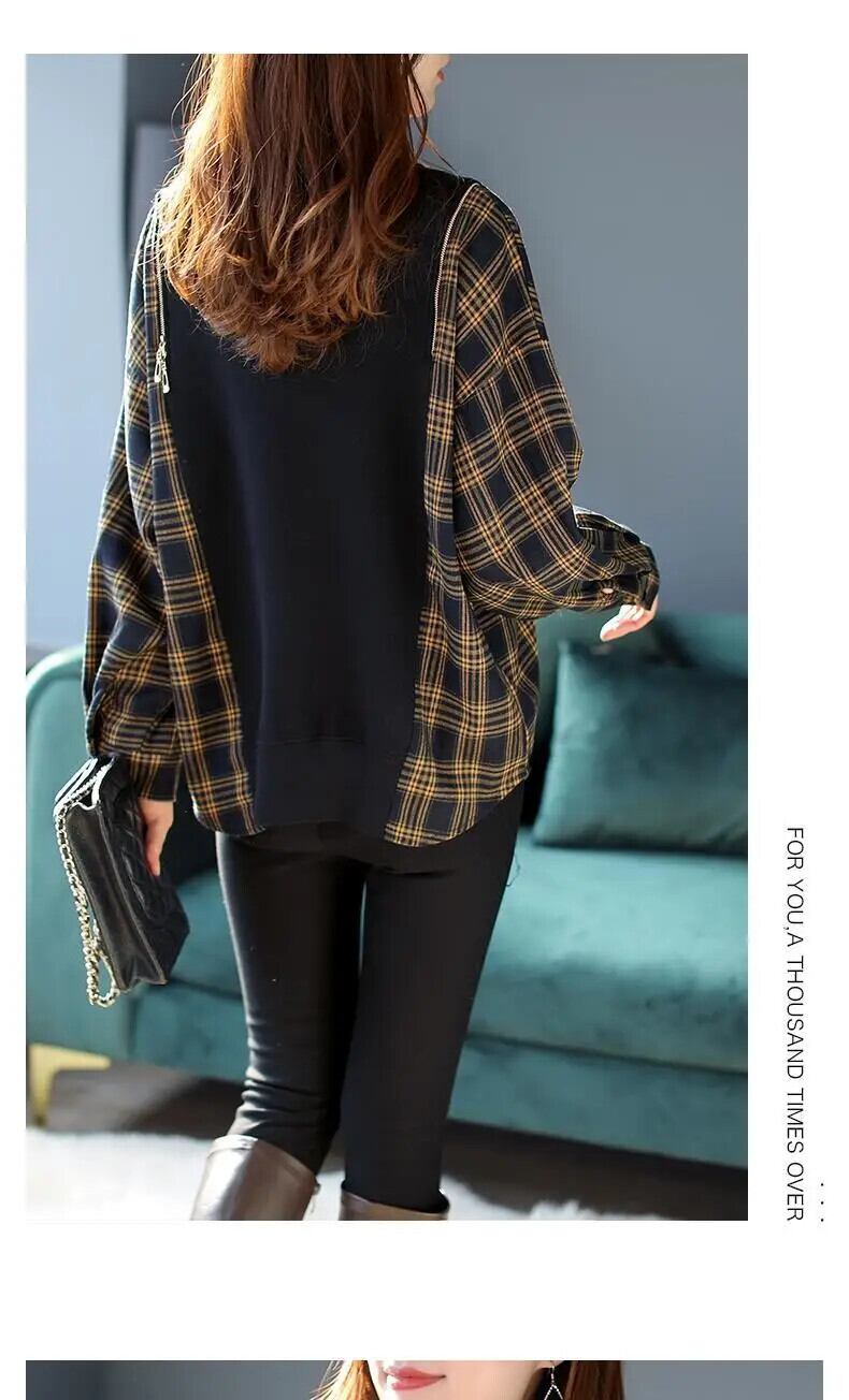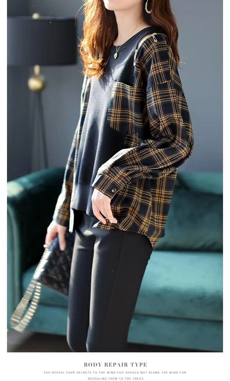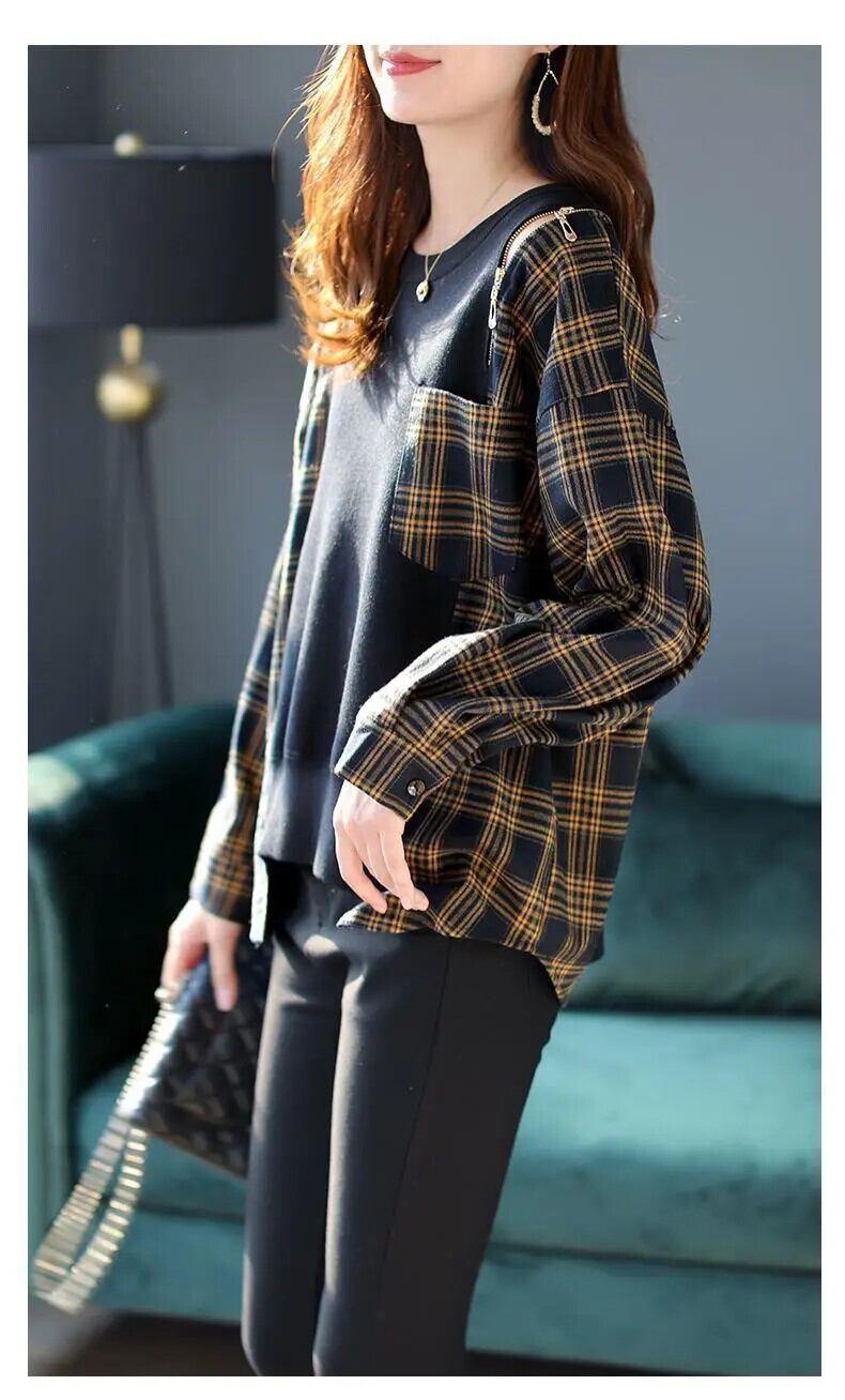 送料無料 O ネックルーズスプライシングジッパーポケットチェック柄ブラウス女性 2022 秋プルオーバーオールマッチシャツ オータム 秋物 Oネック AE1288776663182318851