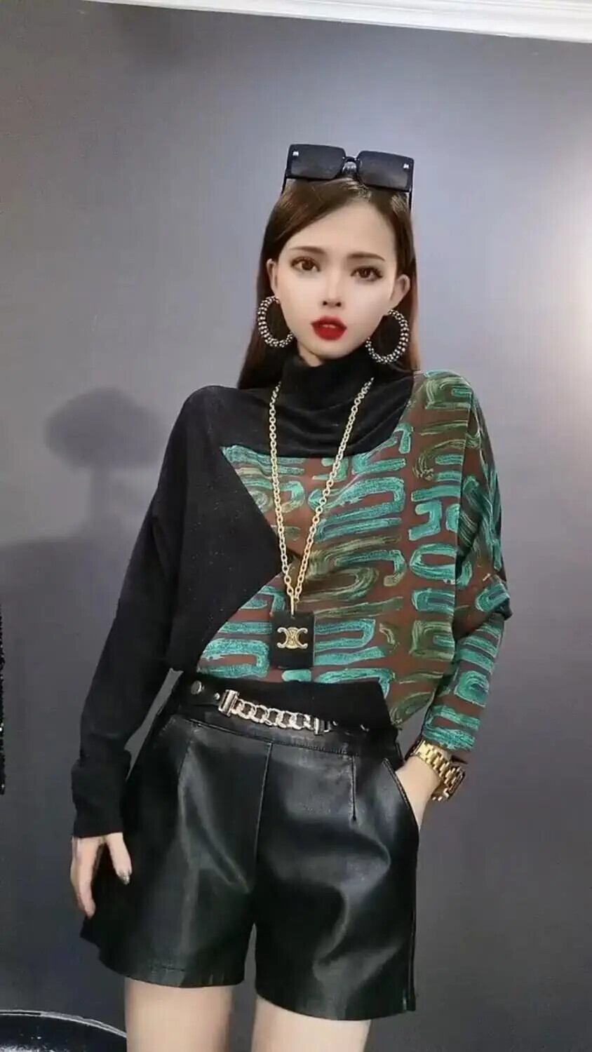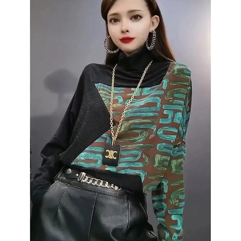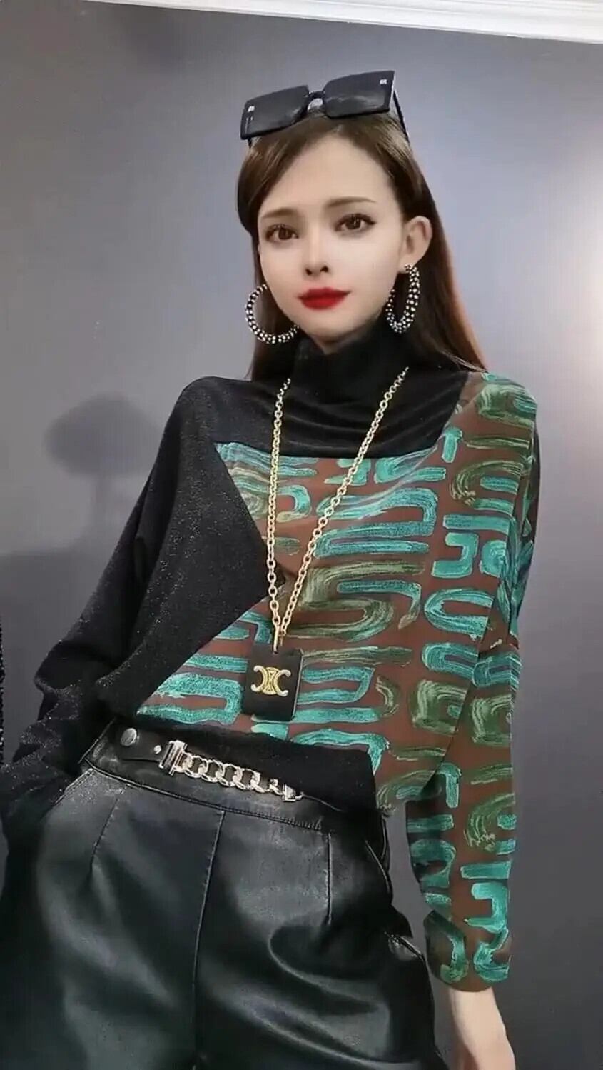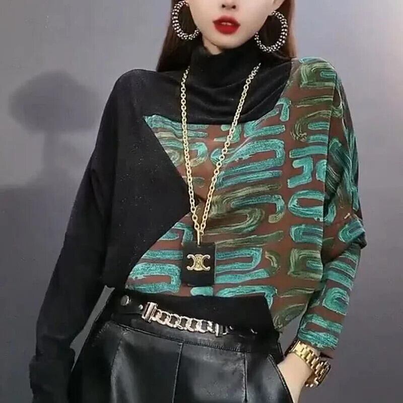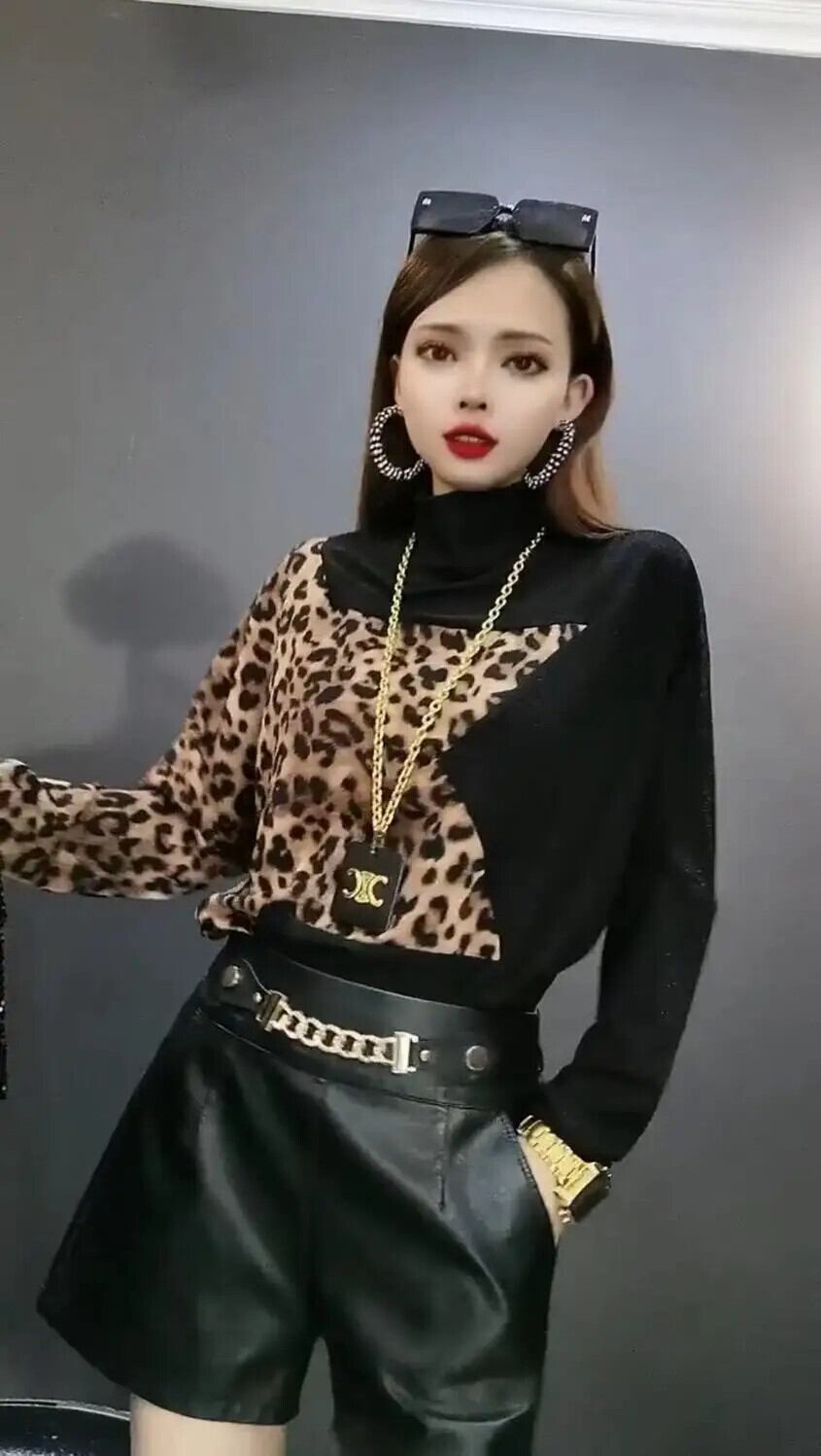 送料無料 タートルネックスプライシングプリントヒョウブラウス女性の 2023 秋冬ルーズプルオーバー通勤シャツ オータム 秋物 ウィンター 冬物 AE1288776628460213336