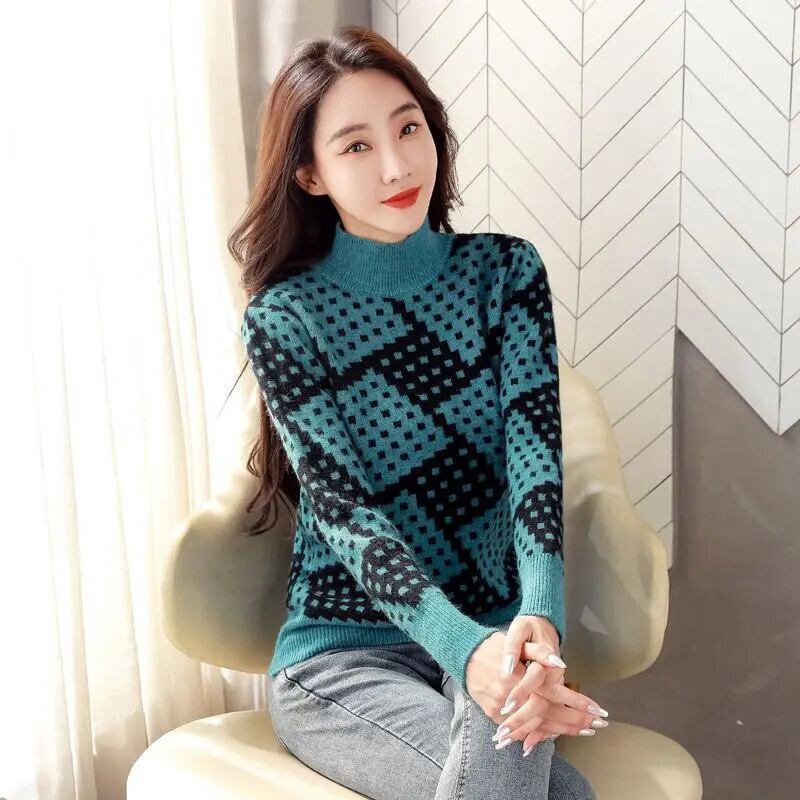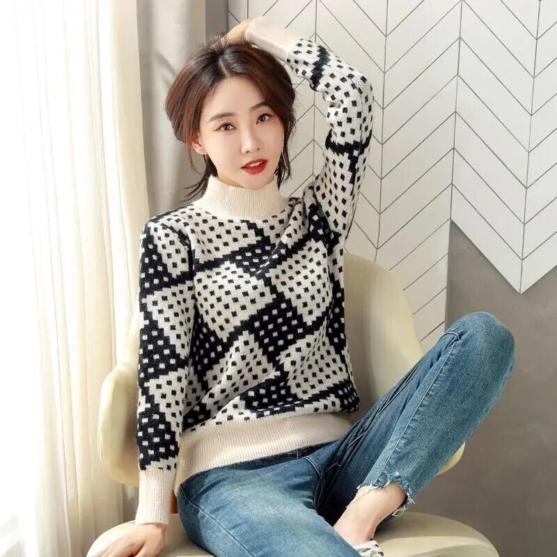 送料無料 スタイリッシュなタートルネックニットスプライシングオールマッチ格子セーター女性の 2022 秋ルーズプルオーバートップス オータム 秋物 AE1288776679276496106