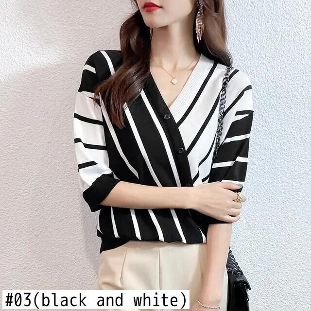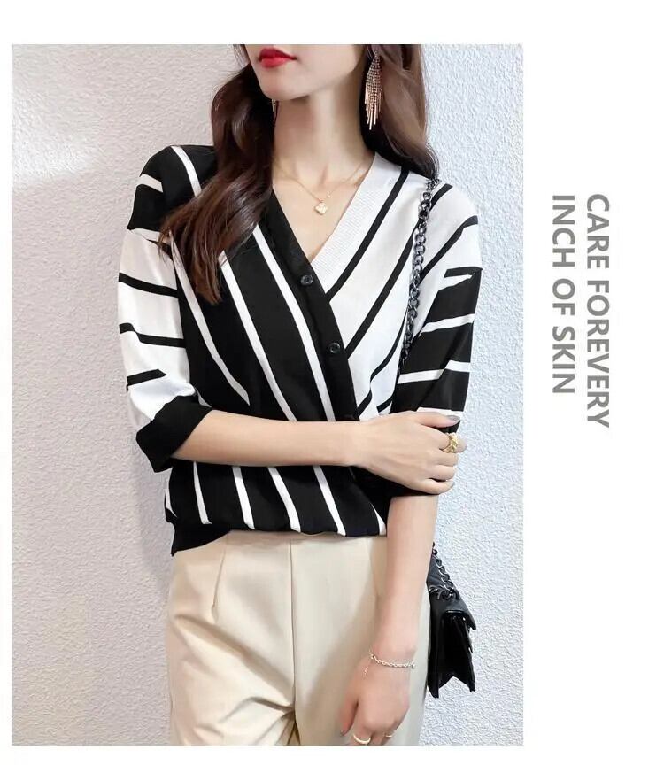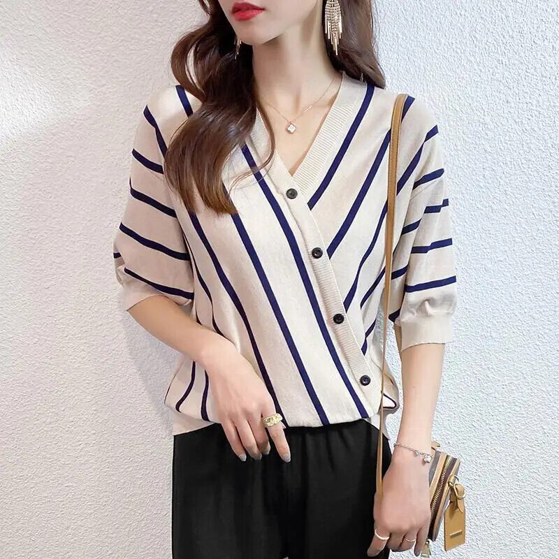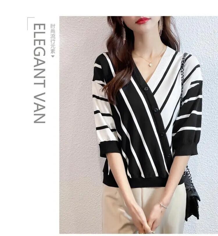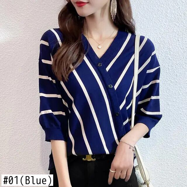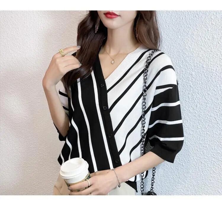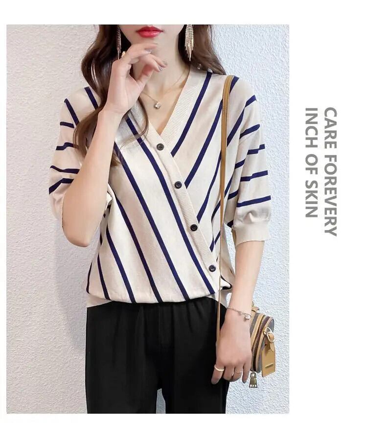 送料無料 V ネック半袖スプライスストライプ非対称ボタンブラウス夏と秋トップスルーズ通勤女性のシャツ ハーフスリーブ サマー 夏物 オータム 秋物 Vネック AE1288776631487628133