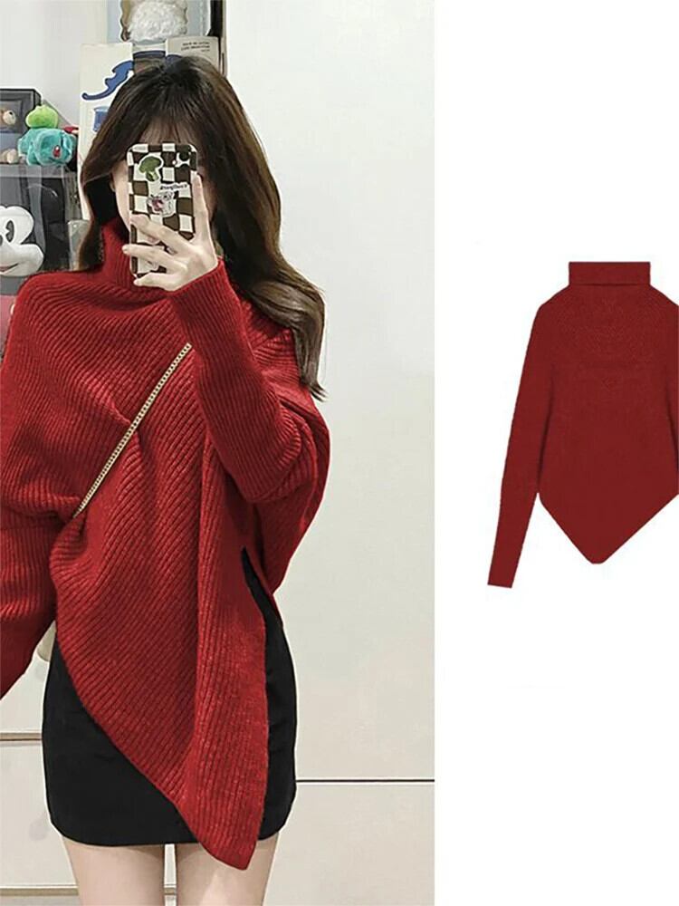 送料無料 タートルネック不規則なバットウィングスリーブセーター女性の 2023 冬ルーズプルオーバー非対称トップス ウィンター 冬物 AE1288776636193890332