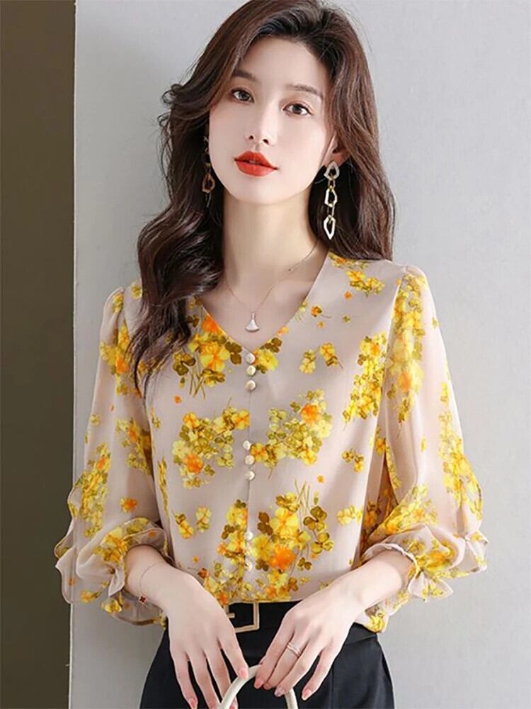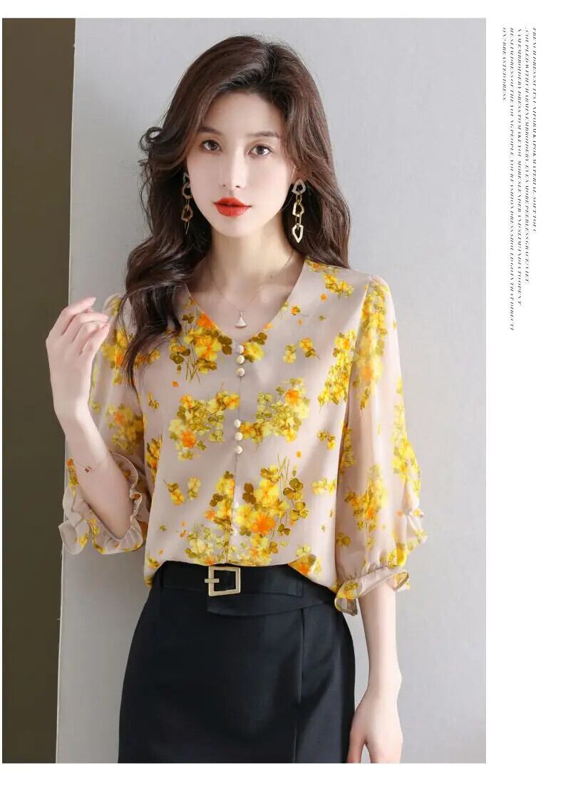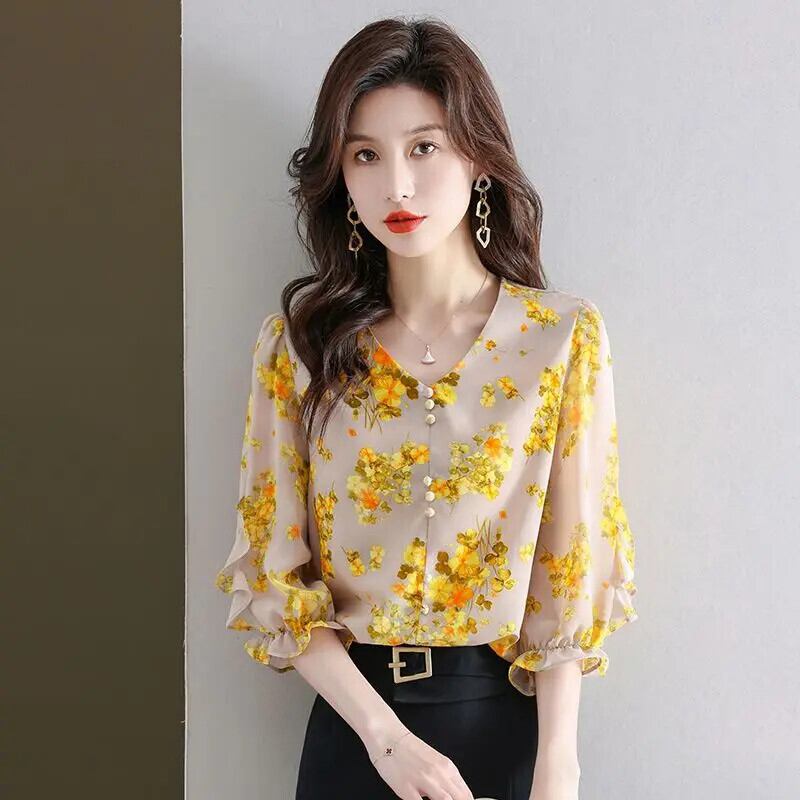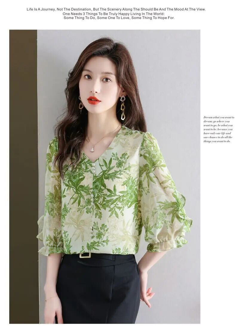 送料無料 ヴィンテージプリント V ネックバタフライスリーブシフォンブラウス女性 2024 夏ルーズオールマッチトップスオフィスレディシャツ サマー 夏物 Vネック ビンテージ 会社 学校 通勤や通学にも AE1288776661065282707
