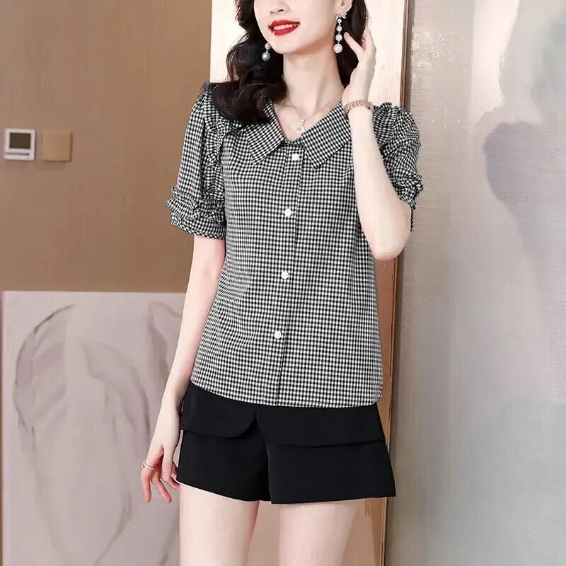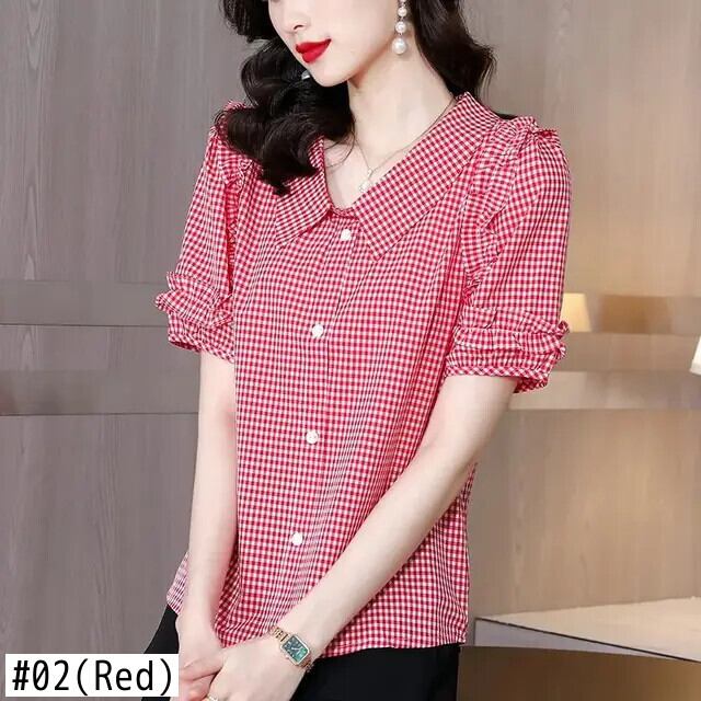 送料無料 プリントピーターパンカラーフリルチェック柄シャツ女性の 2023 夏特大トップスオフィスレディブラウス ラッフル サマー 夏物 会社 学校 通勤や通学にも AE1288776641368052937