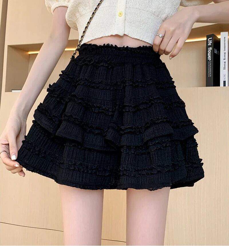 送料無料 Gidyq 甘いかわいいレースミニスカート女性白フリルプリーツスカート夏のウエスト黒 A ラインスカート ホワイト ブラック ラッフル 大人ガーリー スウィート キュート カジュアル サマー 夏物 Aライン AE008077658619784346