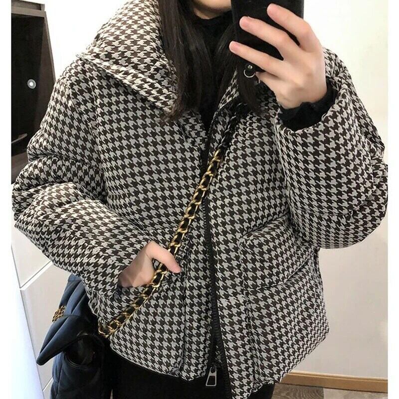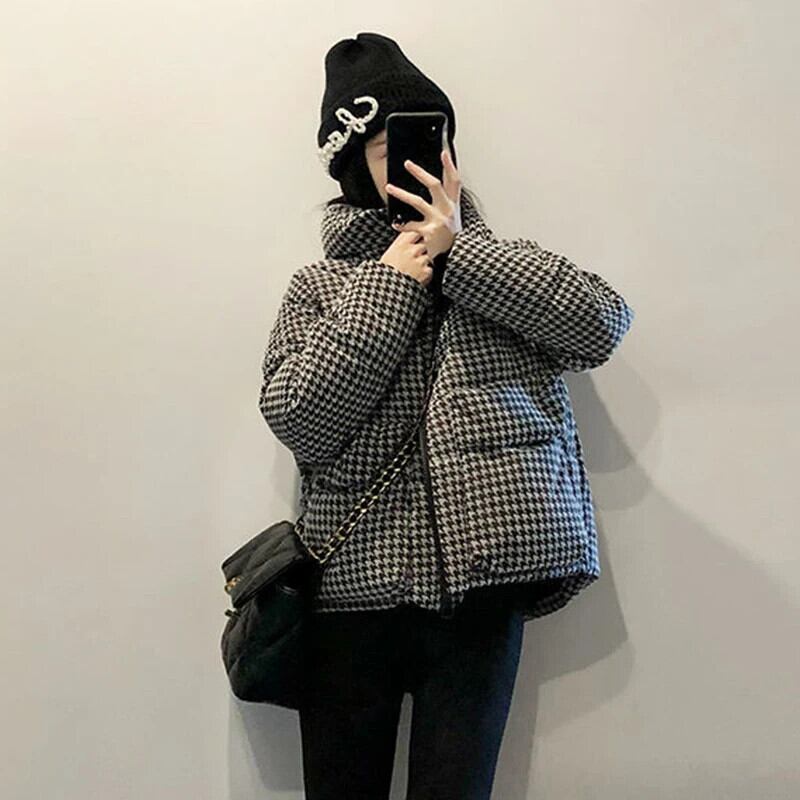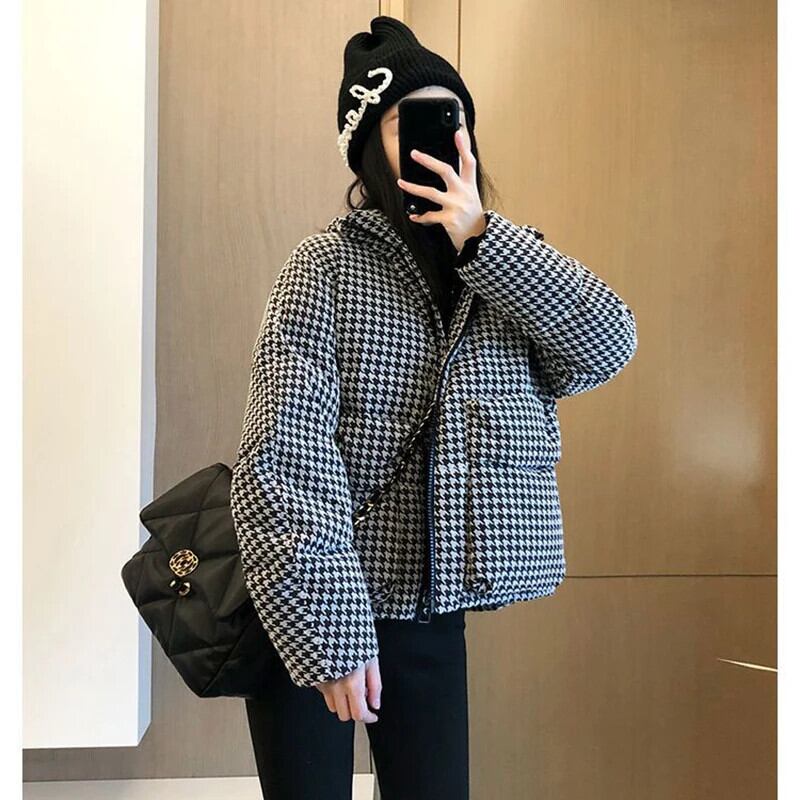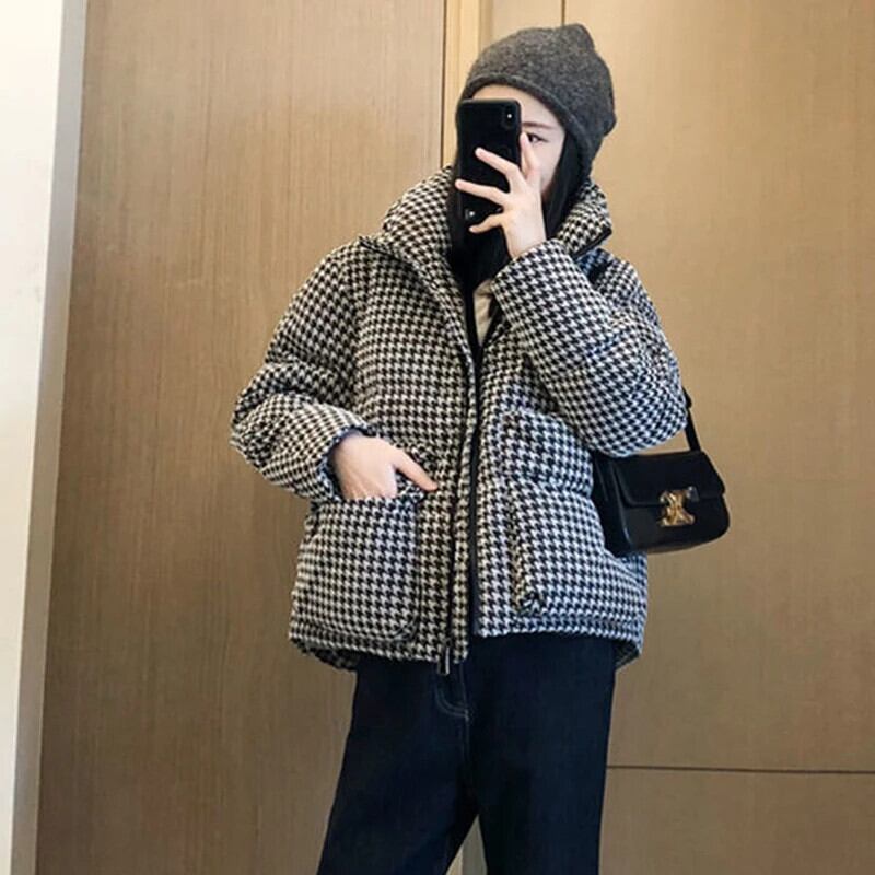 送料無料 Gidyq 女性千鳥格子パーカー冬ルーズ厚く暖かいダウンジャケットクロップドふくらみオーバーコート ウィンター 冬物 AE008077616064962480