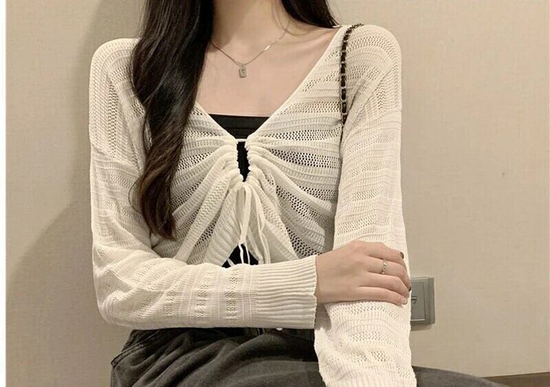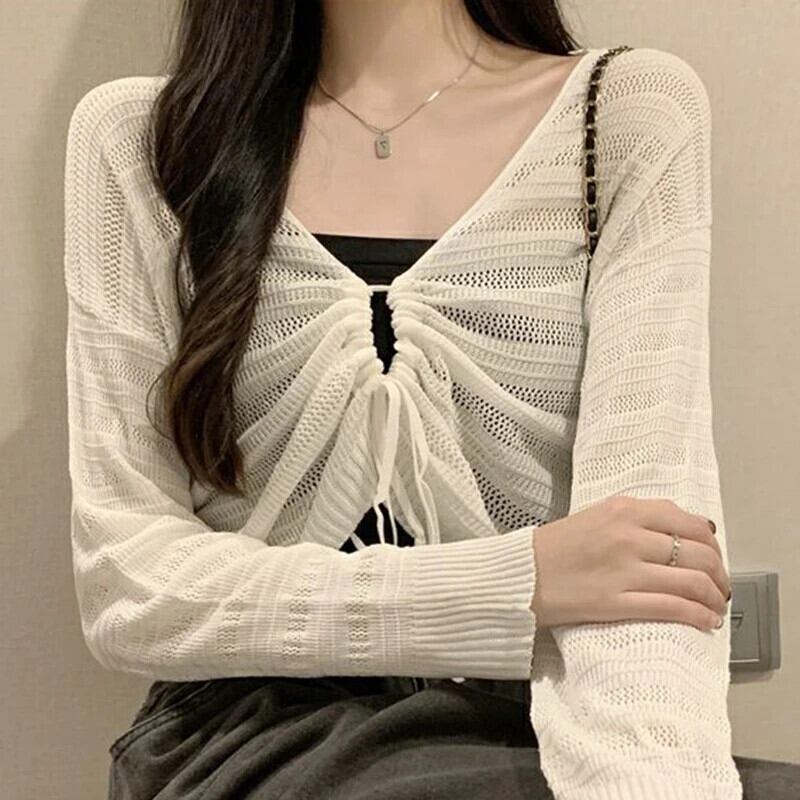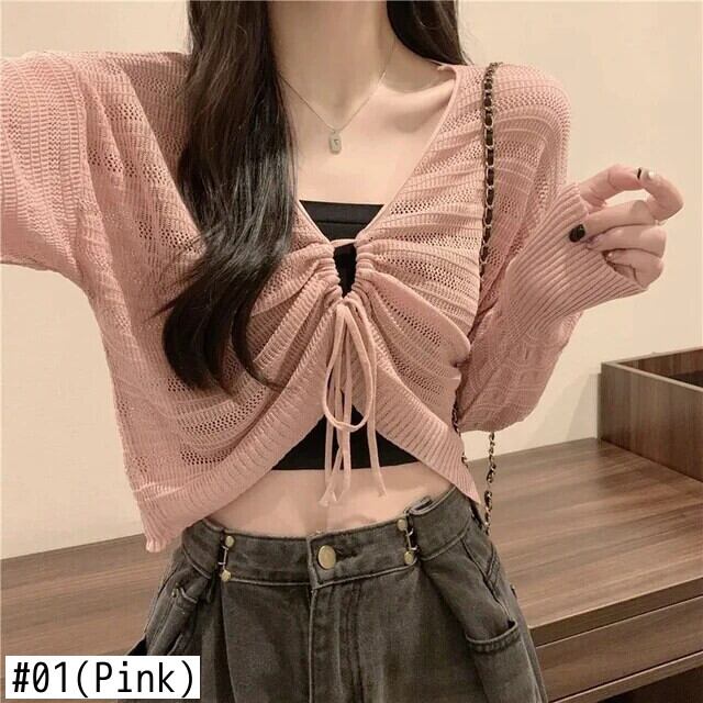 送料無料 Gidyq ピンク中空アウトカーディガン女性甘いスリムシャツ固体すべて一致巾着 V ネックトップ夏 大人ガーリー スウィート キュート カジュアル サマー 夏物 Vネック ソリッドカラー AE008077694140112145