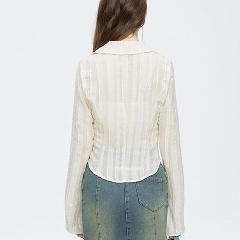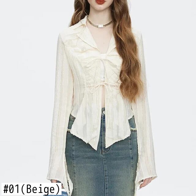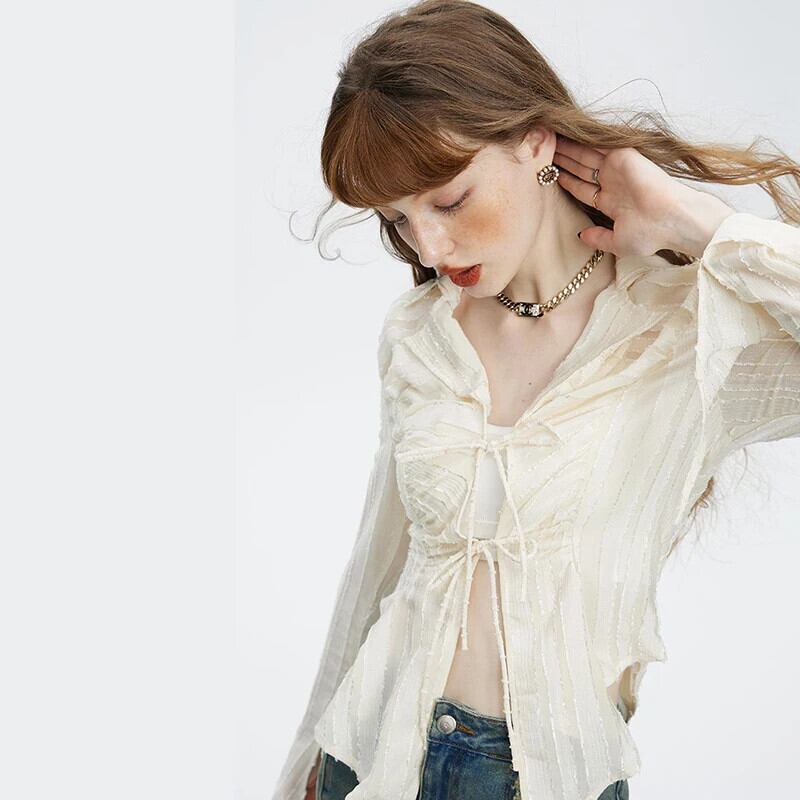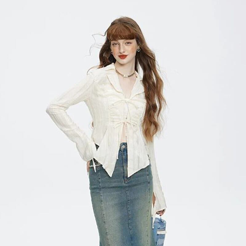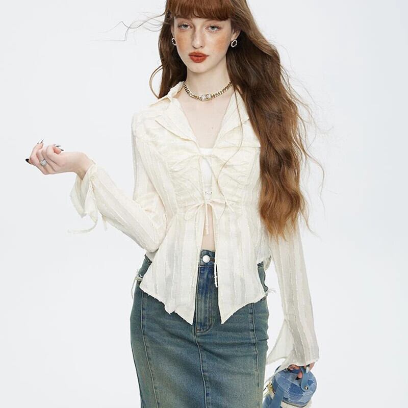送料無料 Gidyq ストリート女性シャツアメリカンスタイルのセクシーなレースアップブラウス Y2K ストライプすべて一致長袖トップス ロング AE008077675528601381