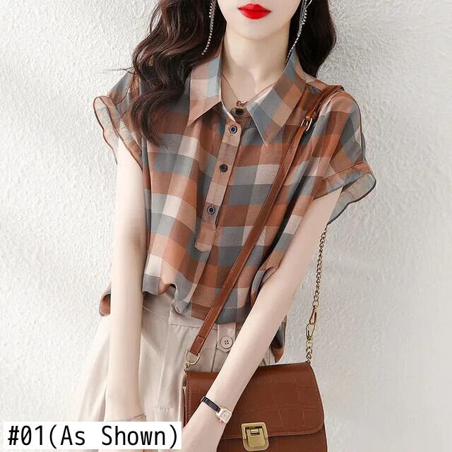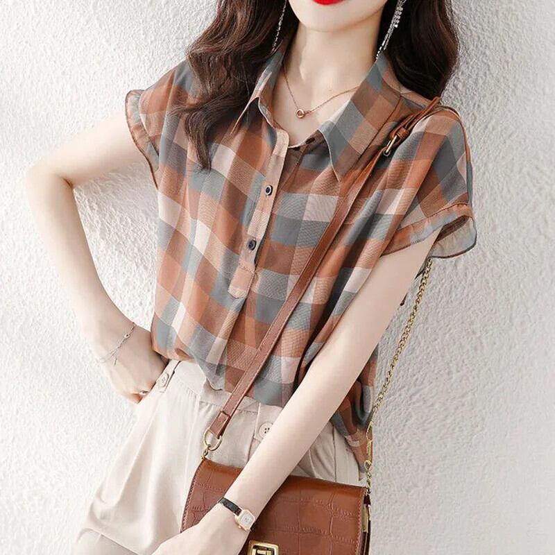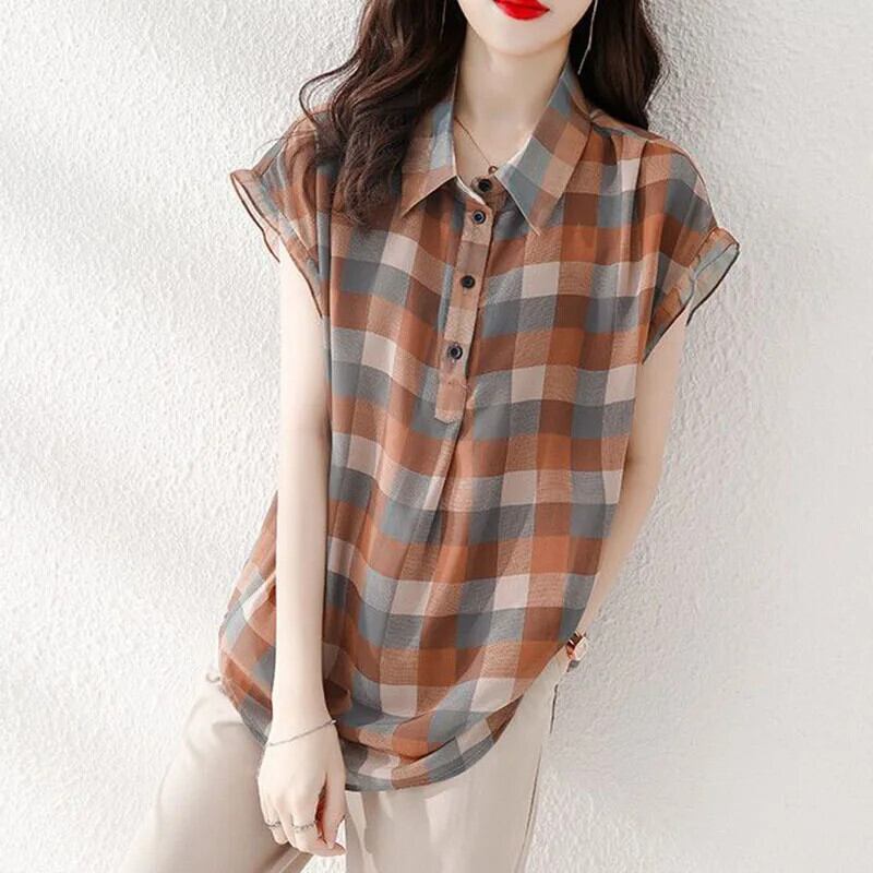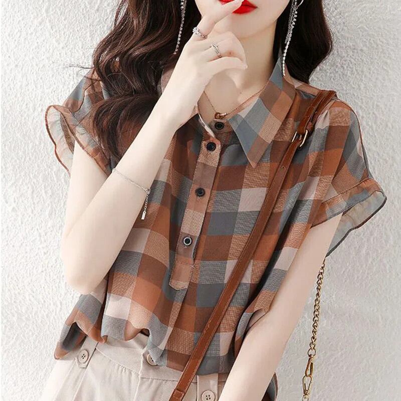 送料無料 Gidyq 女性チェック柄シャツストリートルーズ半袖トップス Y2K すべて一致ブルー Seサマー ショート ハーフスリーブ 夏物 AE008077671750463047