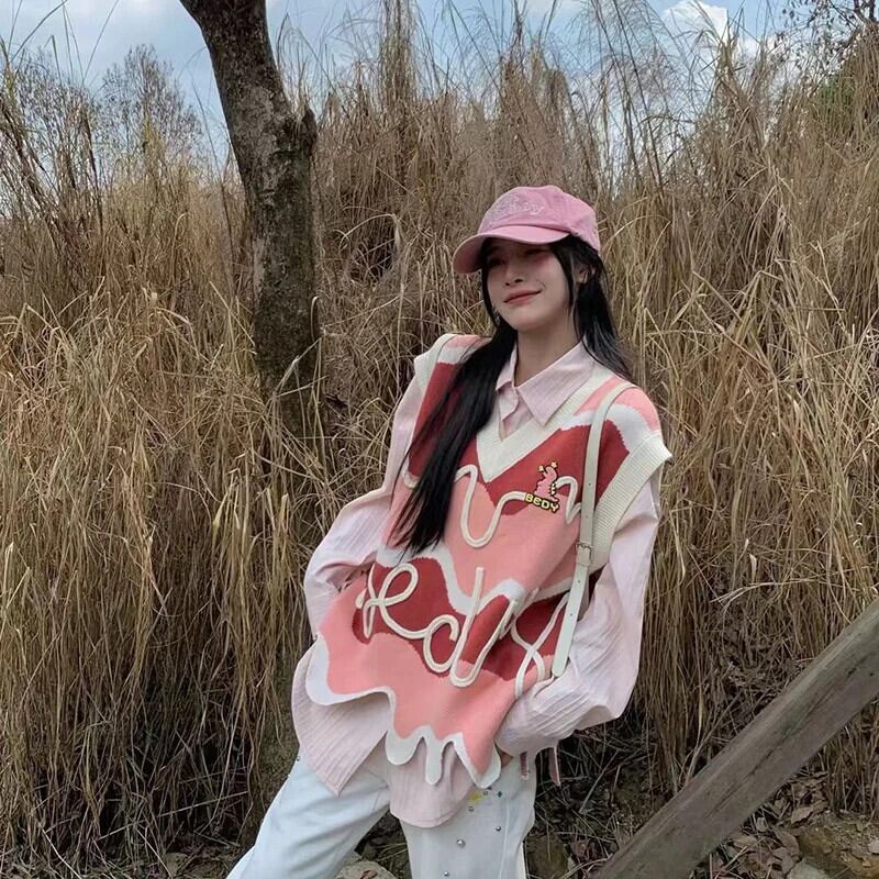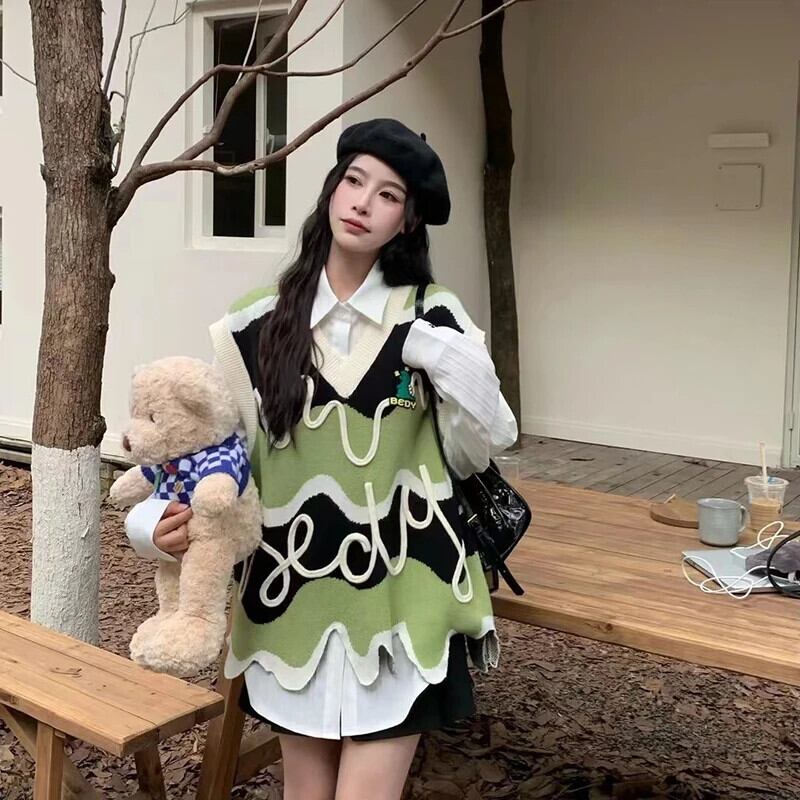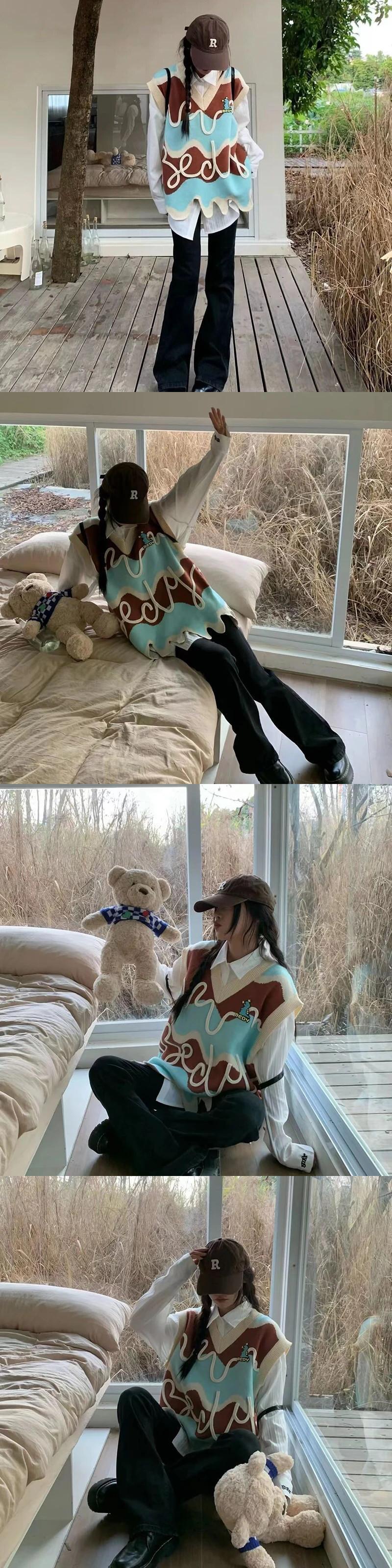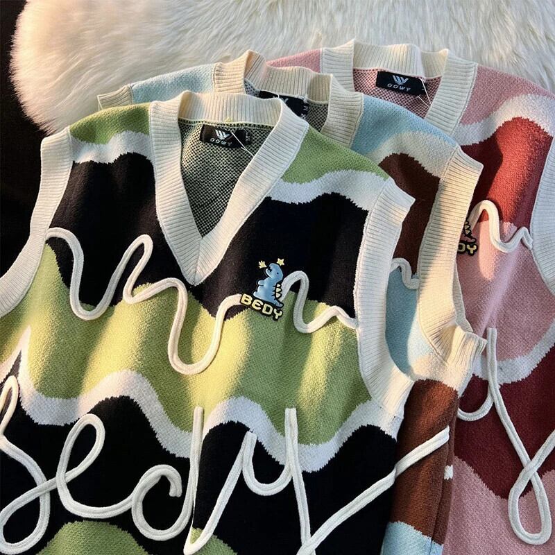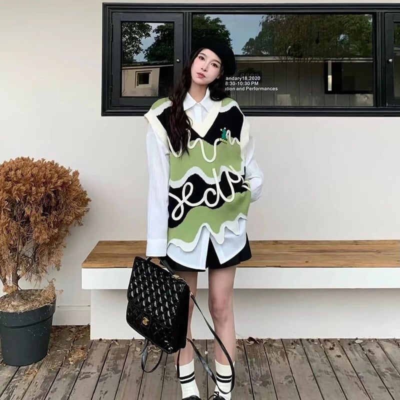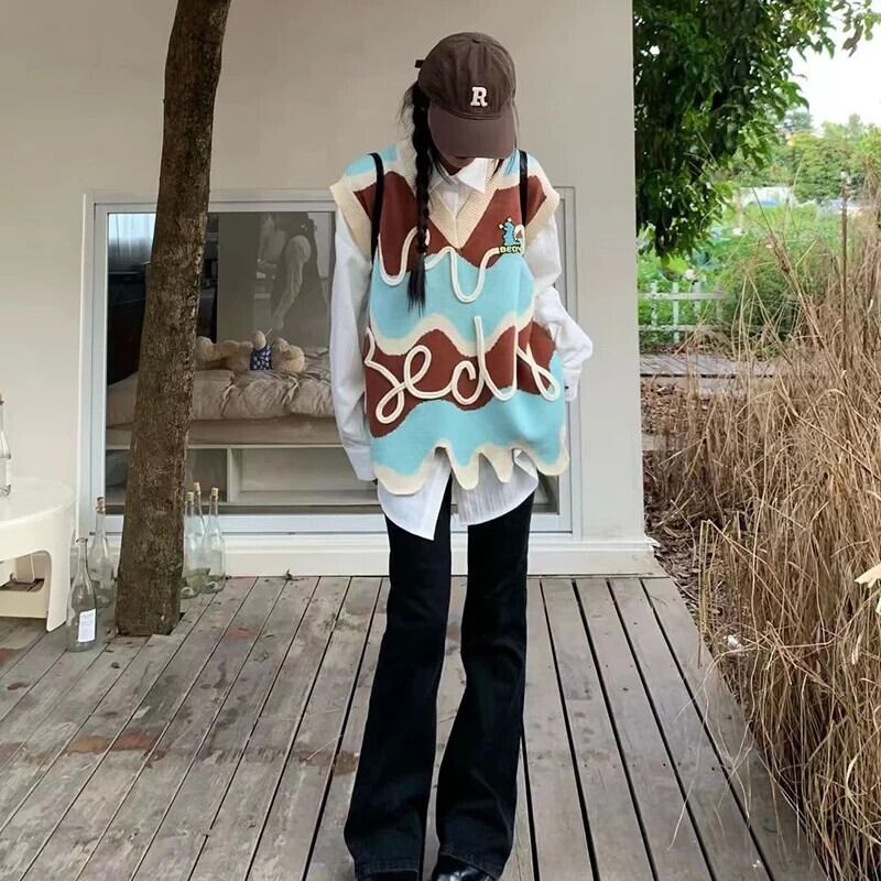 送料無料 Gidyq 女性セーターベスト不規則なパッチワークルーズニットチョッキ秋プレッピーノースリーブトップス オータム 秋物 AE008077663894490801