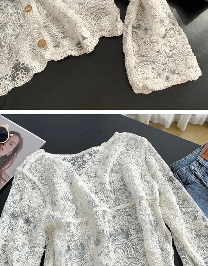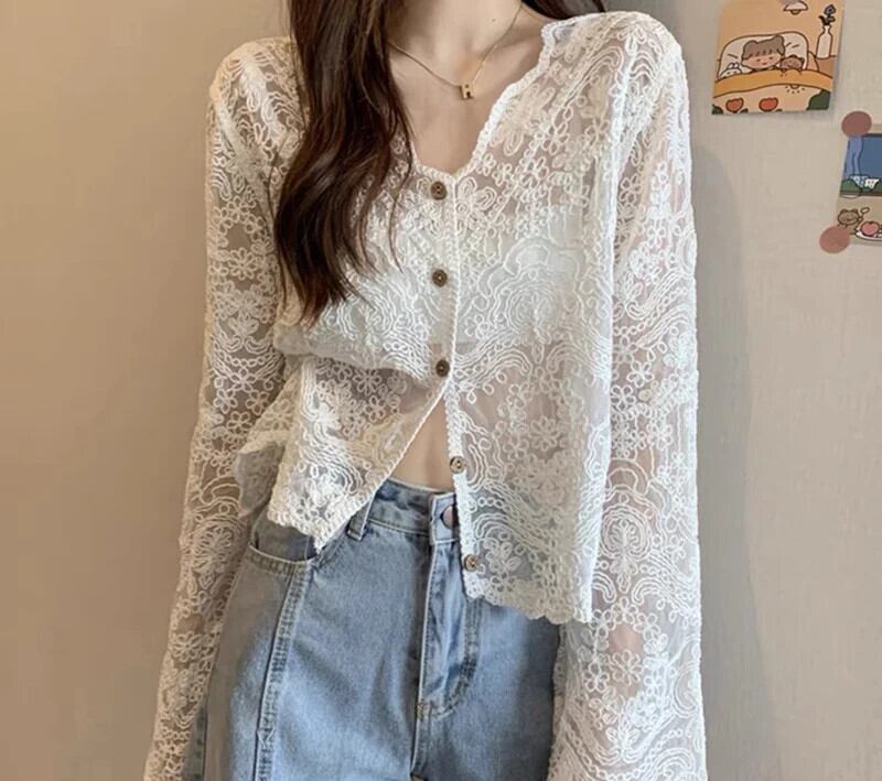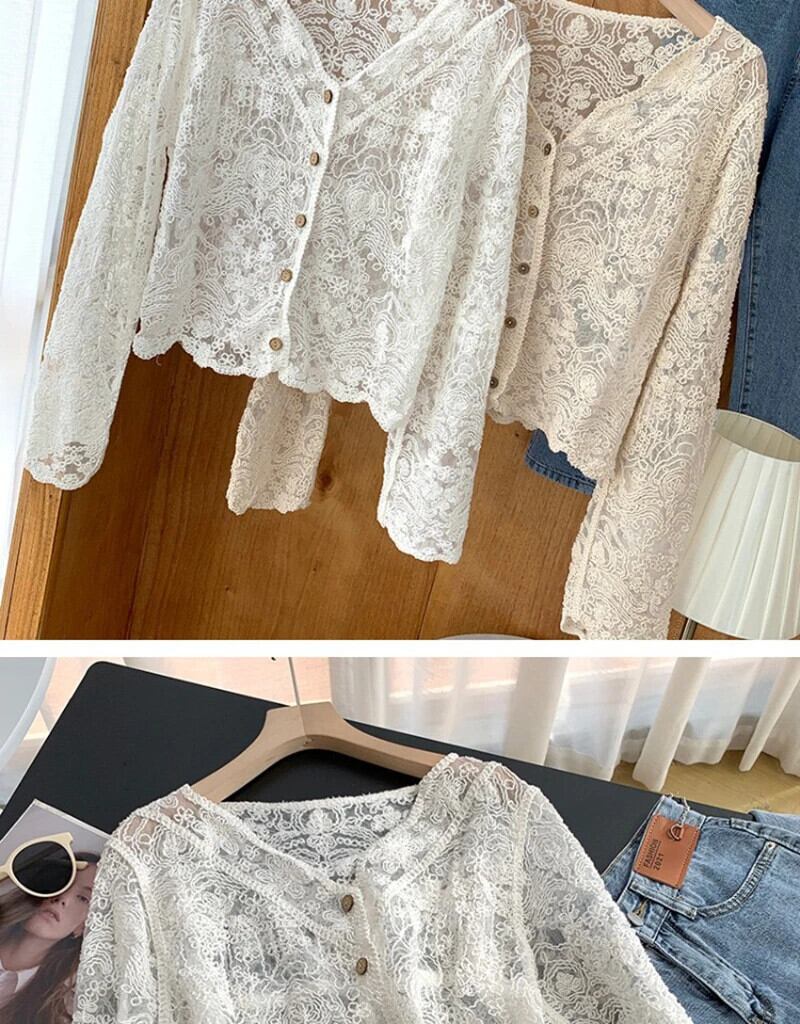 送料無料 Gidyq 女性レース中空長袖シャツプレッピースタイル甘いブラウス夏ルーズすべて一致アプリコットトップス ロング 大人ガーリー スウィート キュート カジュアル サマー 夏物 AE008077641185792378