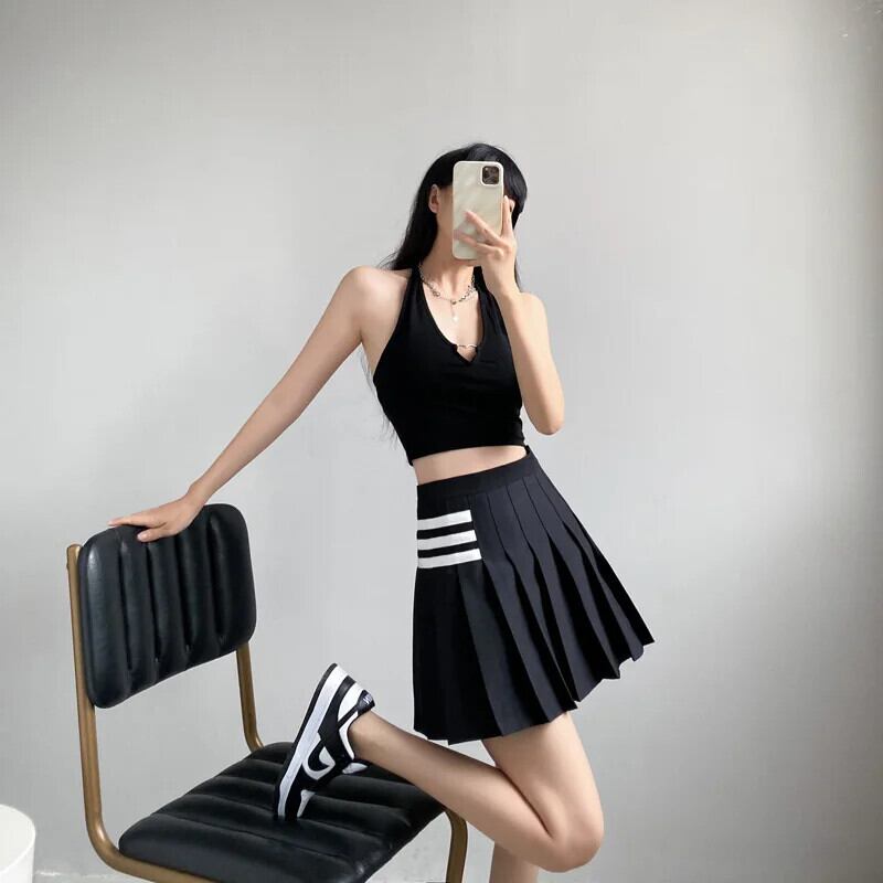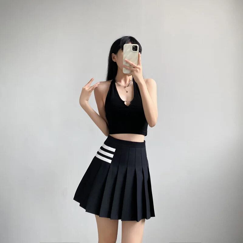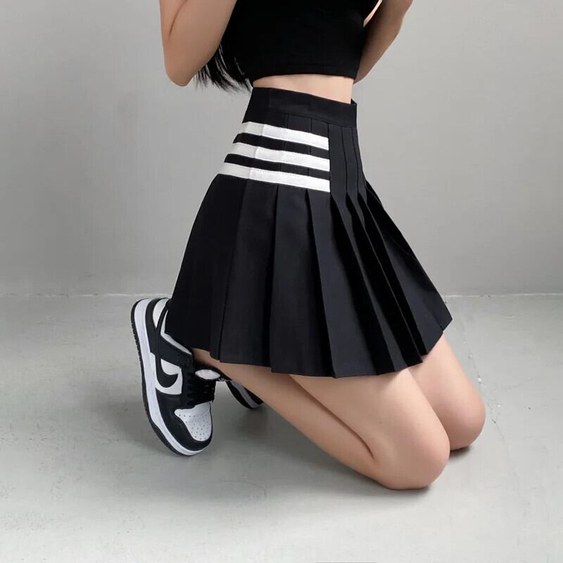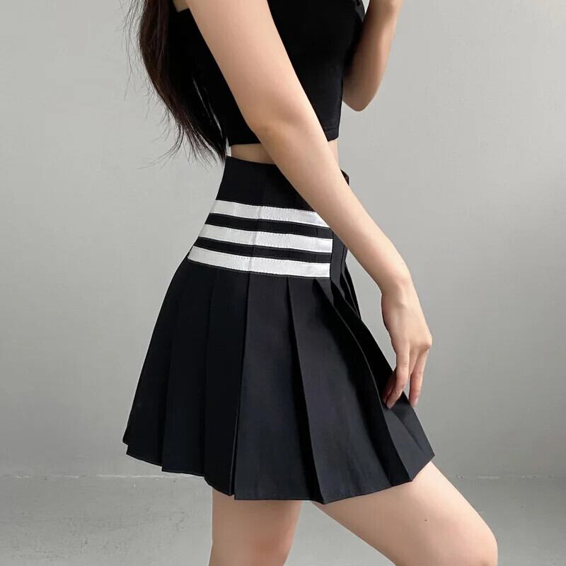 送料無料 Gidyq 女性黒プリーツスカート夏のストライプミニスカートウエスト A ラインスカート ブラック サマー 夏物 Aライン AE008077637565951861