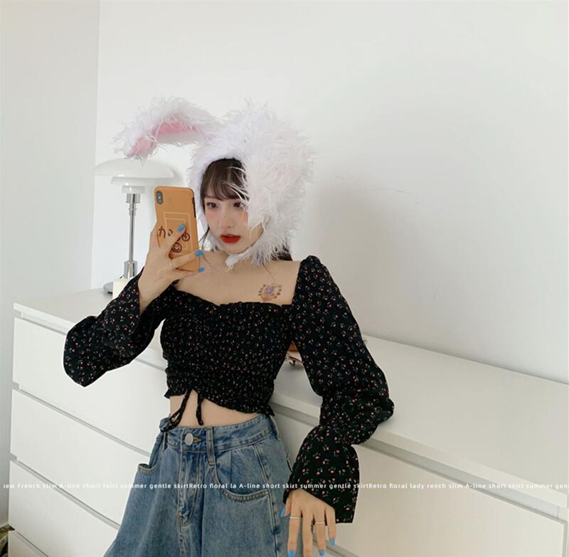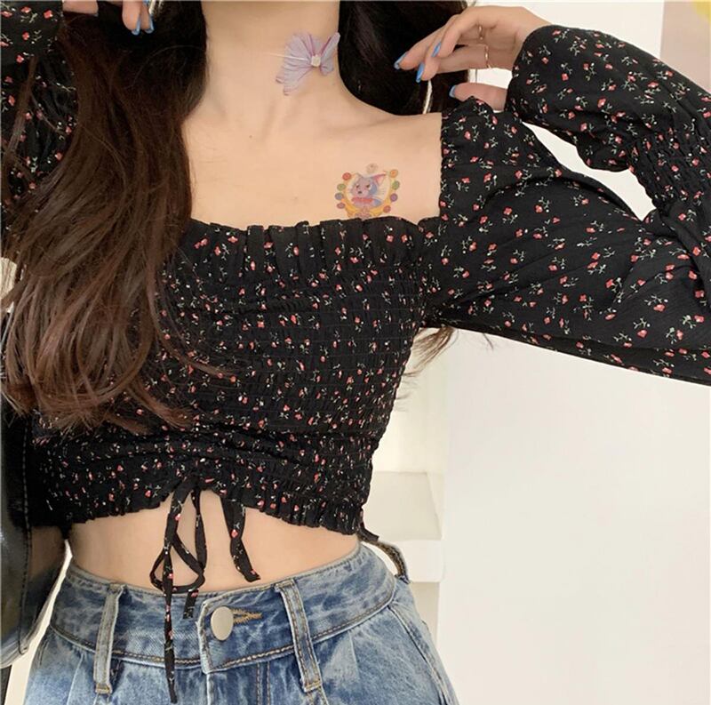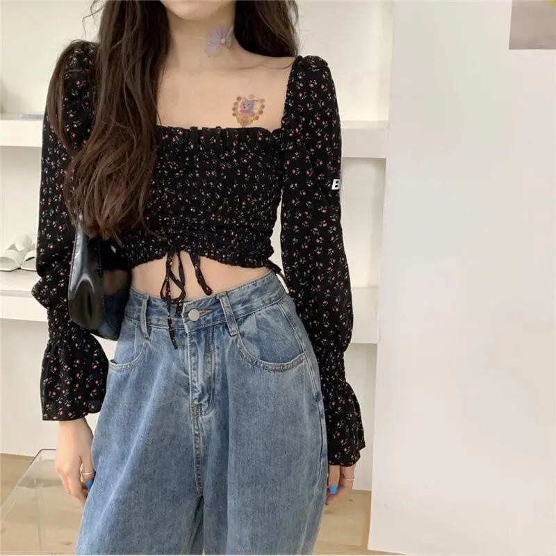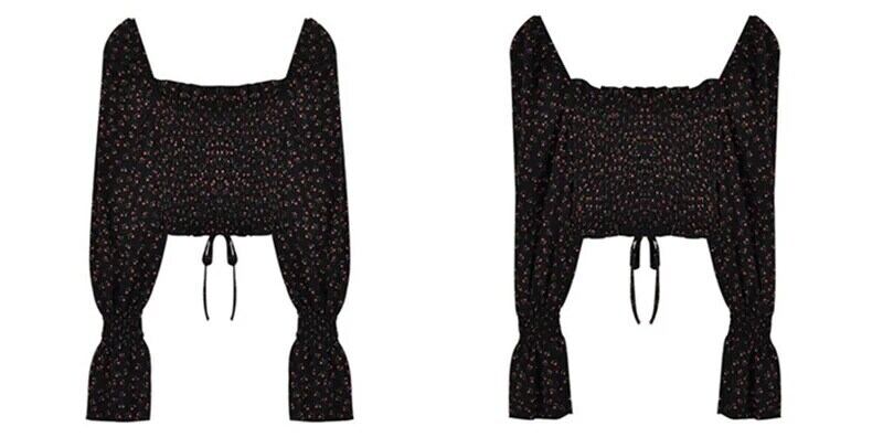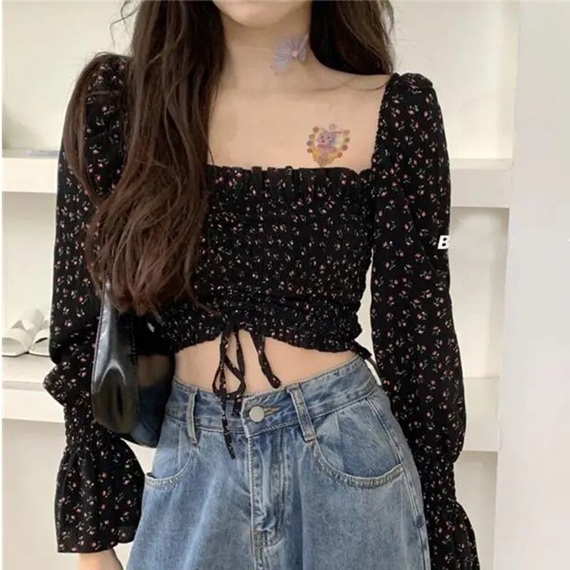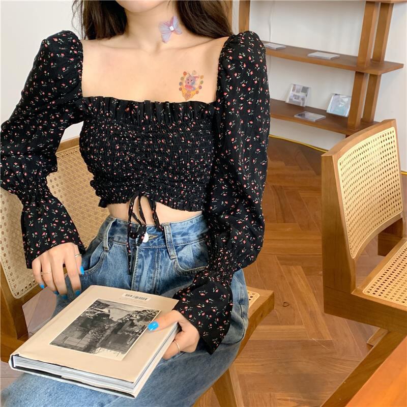 送料無料 Gidyq 女性花柄シャツレトロクロップトップ夏甘いスクエアカラー長袖シフォンブラウス ロング 大人ガーリー スウィート キュート カジュアル サマー 夏物 スクウェア AE008077687939063778