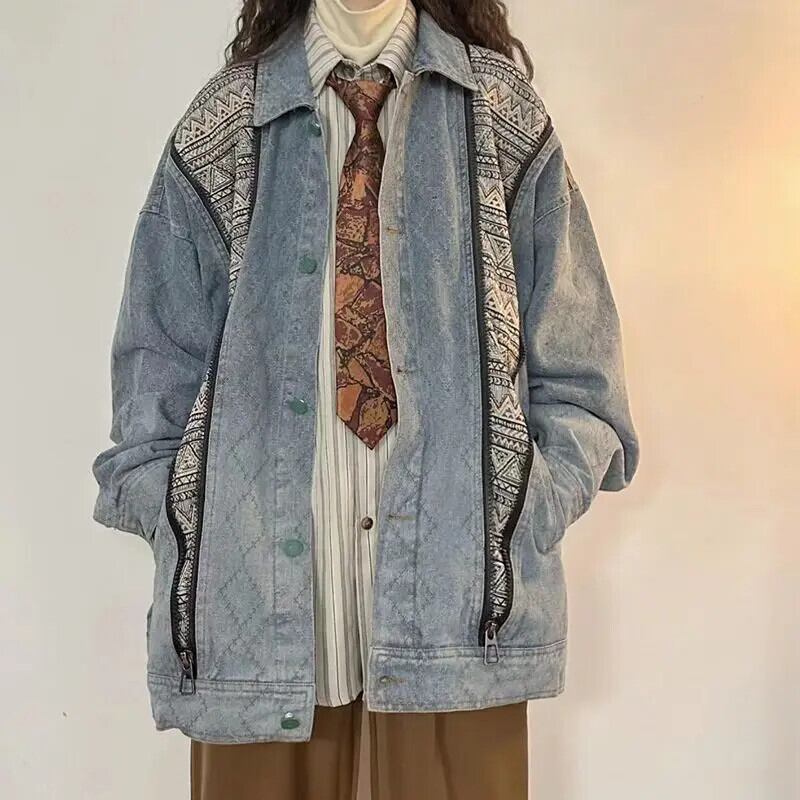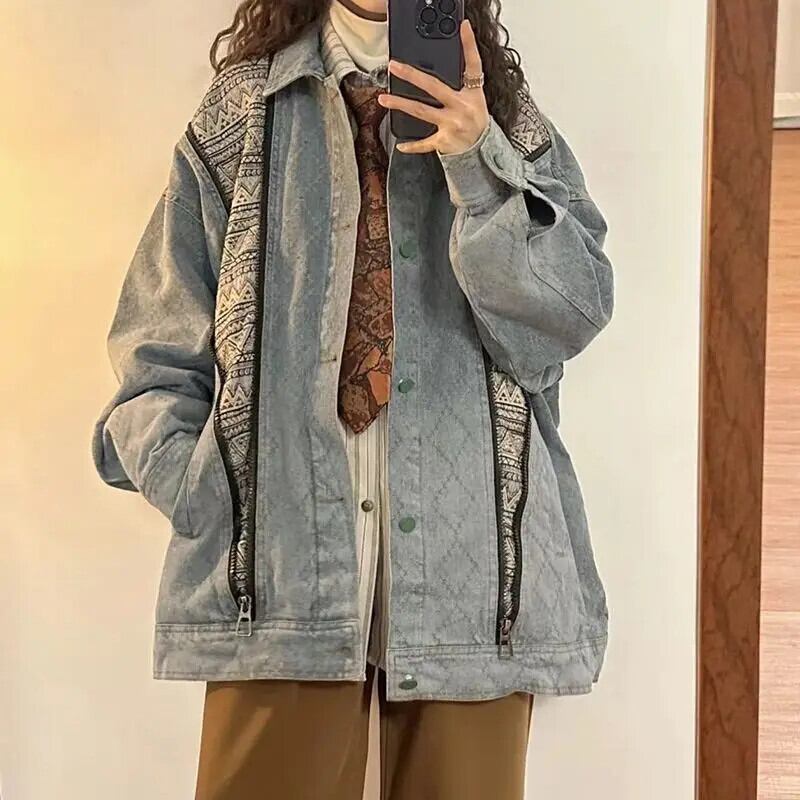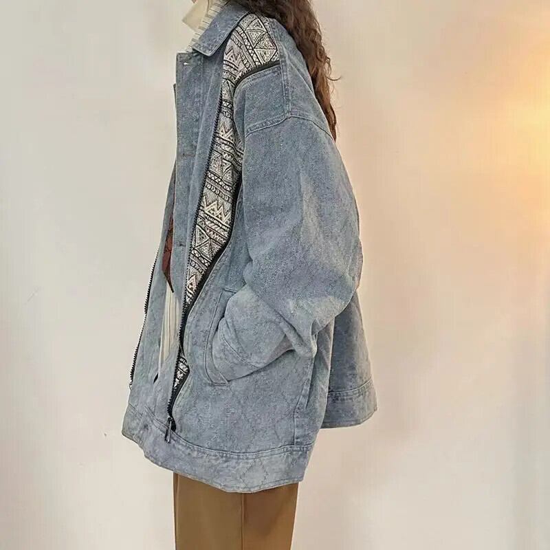 送料無料 Gidyq ストリート女性デニムジャケットアメリカンスタイルパッチワークルーズ長袖コート秋ジッパー生き抜く ロング オータム 秋物 AE008077683557382295