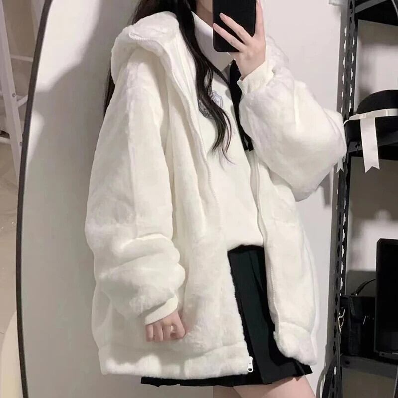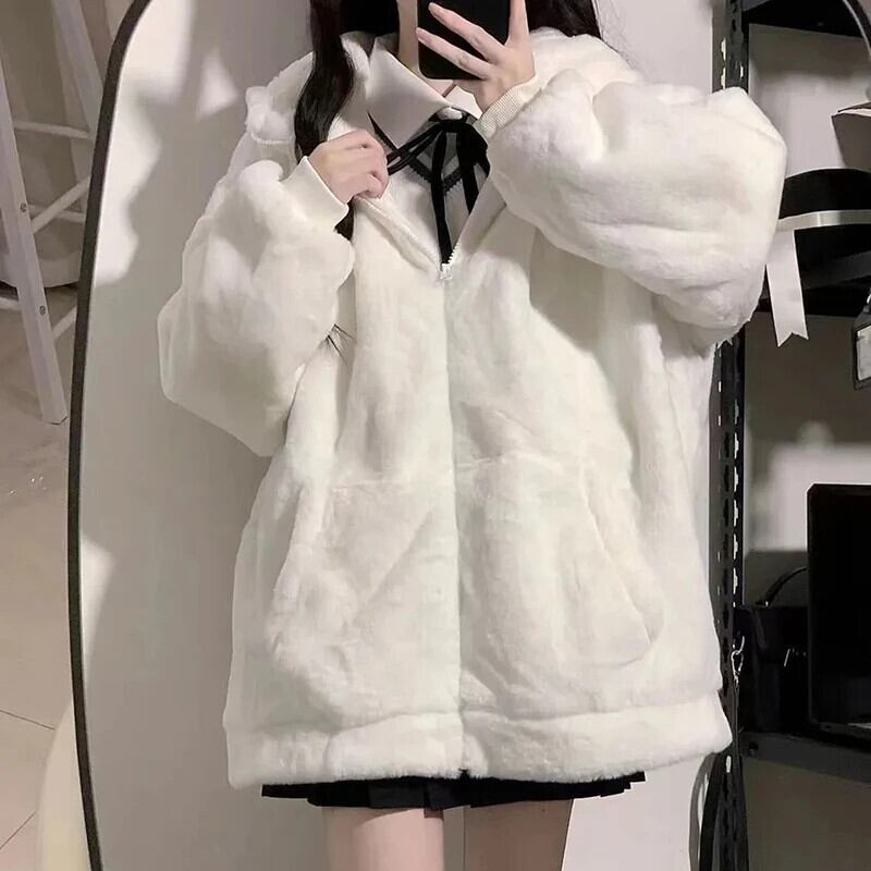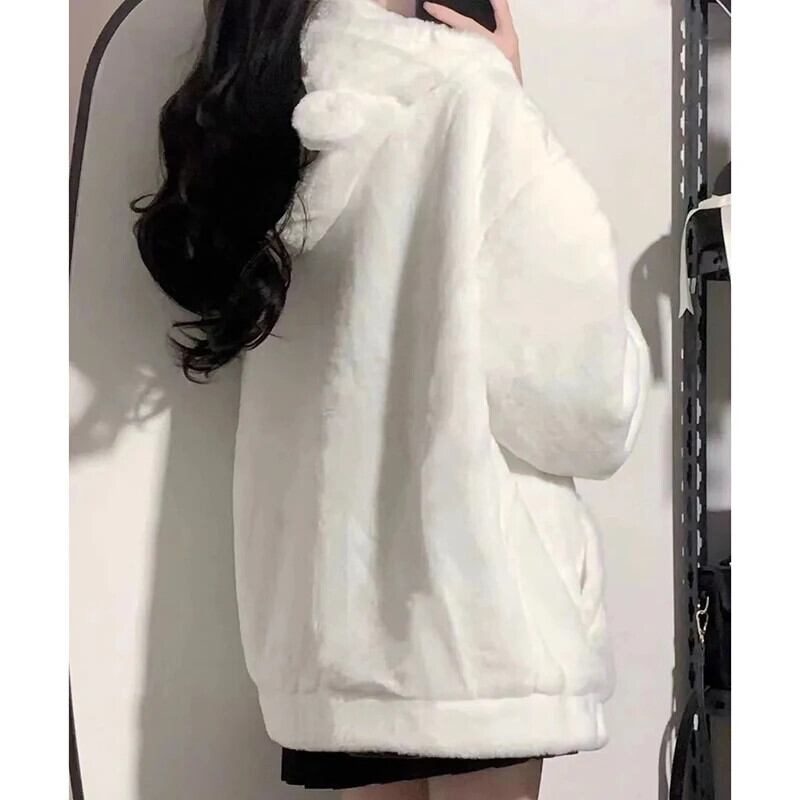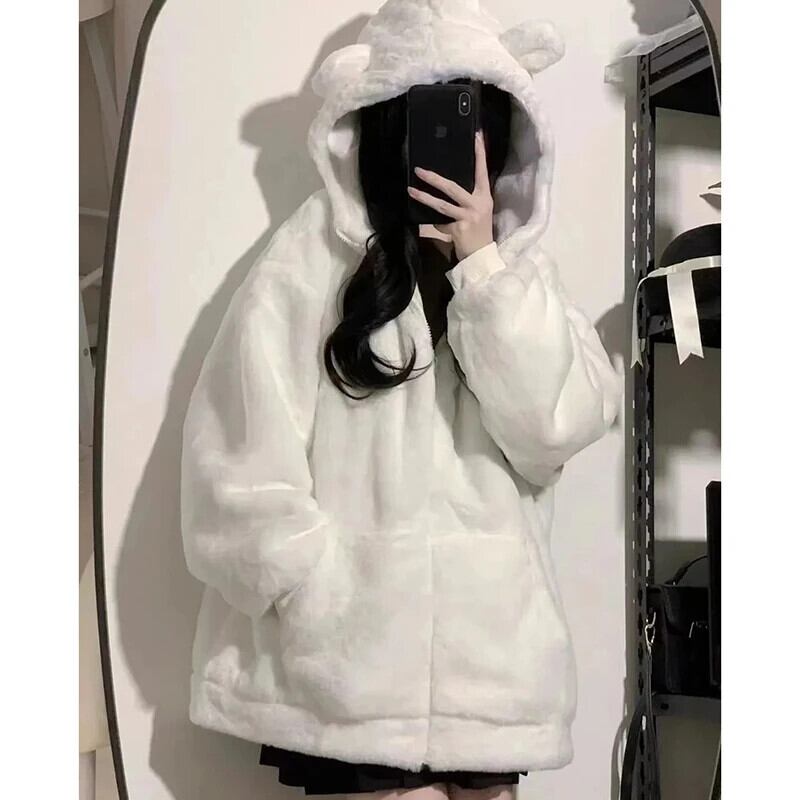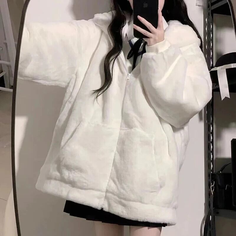 送料無料 Gidyq 女性ウサギの毛皮のコート豪華なフード付きジャケット冬厚く暖かい学生かわいいルーズオーバーコート 大人ガーリー スウィート キュート カジュアル ウィンター 冬物 AE008077657552871577