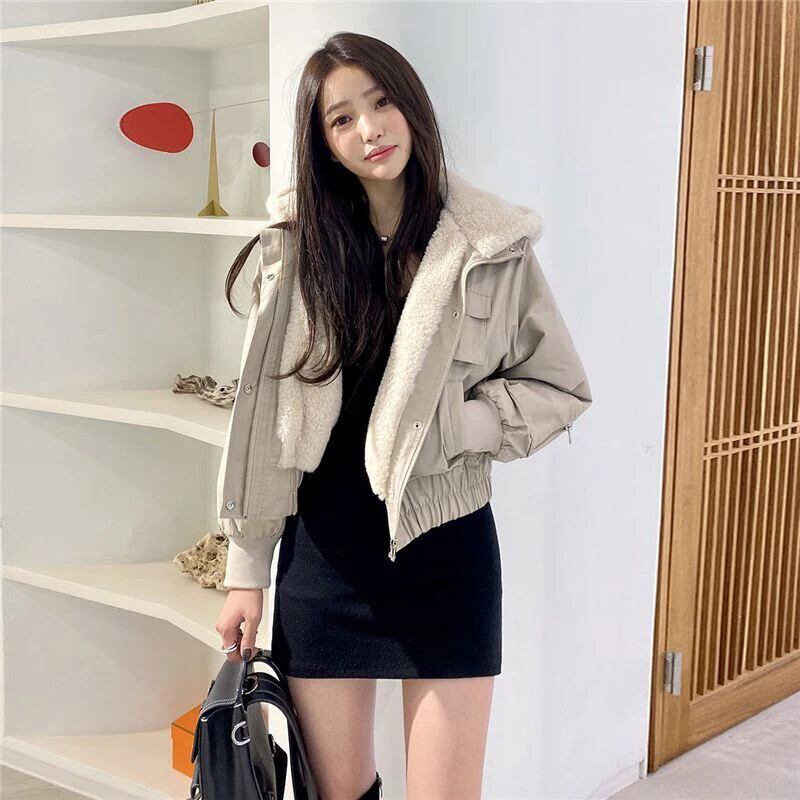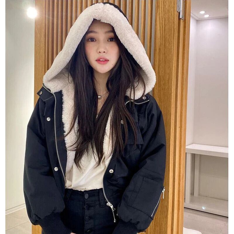 送料無料 Gidyq 女性パーカー冬ストリートフード付きパファージャケット厚くて暖かい毛深いクロップドアウター ウィンター 冬物 AE008077684340680036