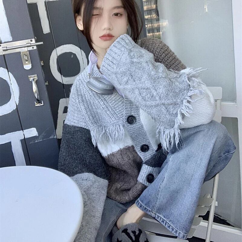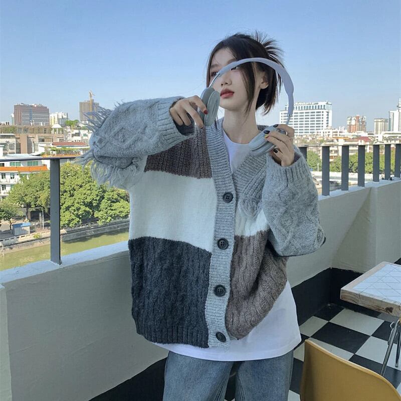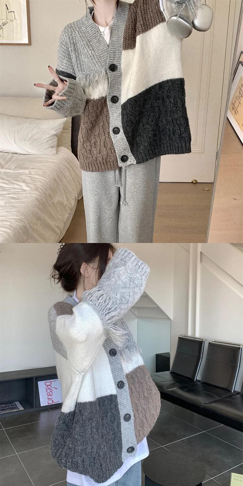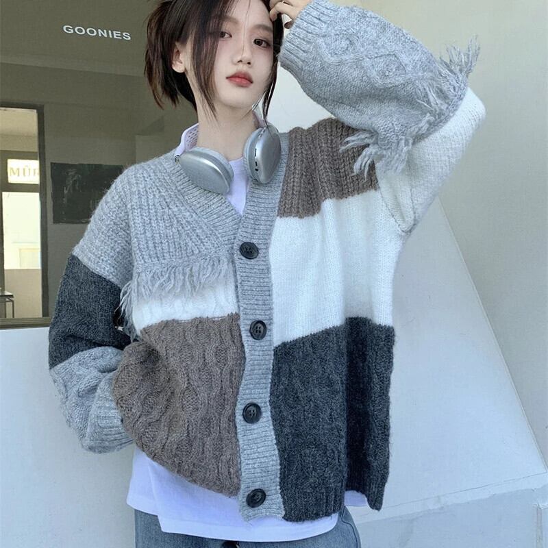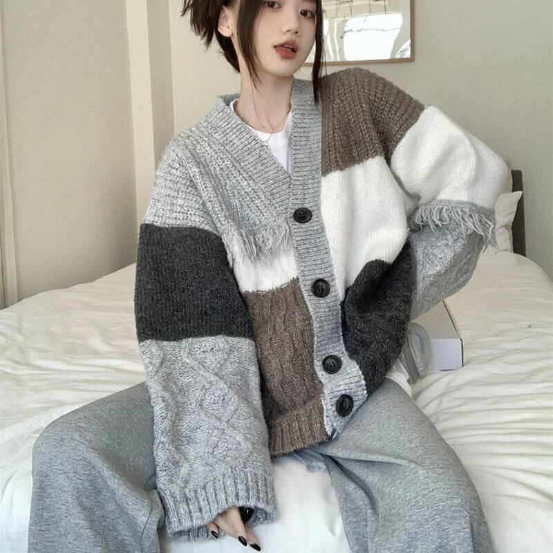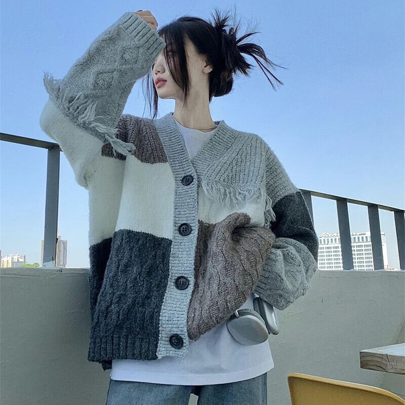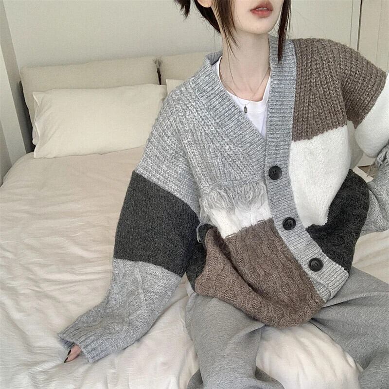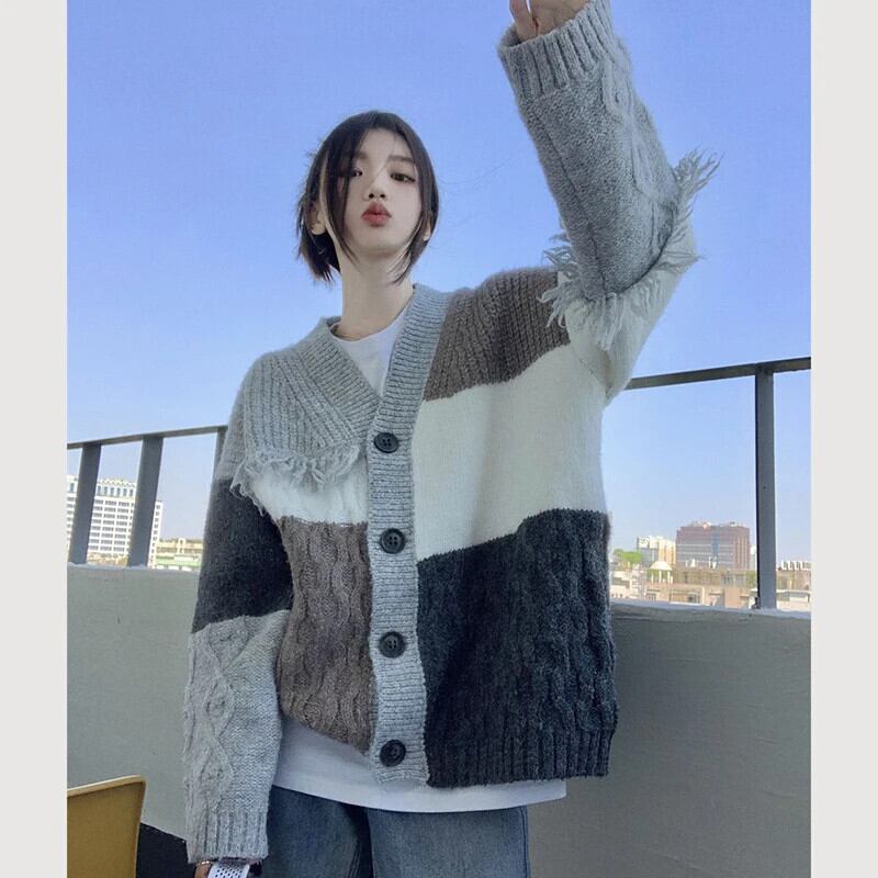 送料無料 Gidyq 女性カーディガンセーターストリートテルルーズニットコートすべて一致パッチワークジャケット AE008077635793126166