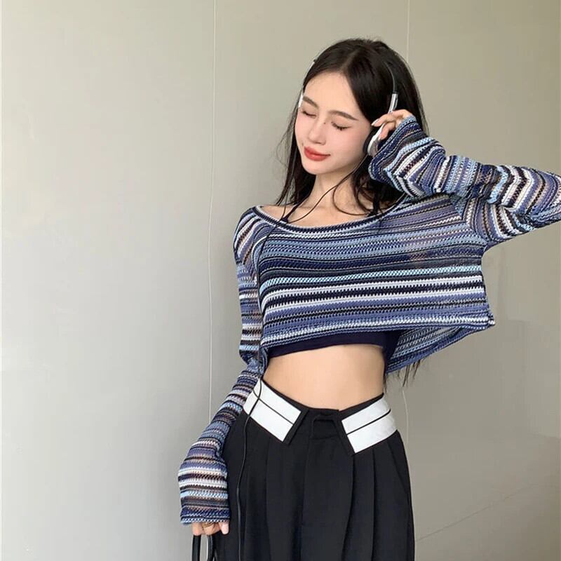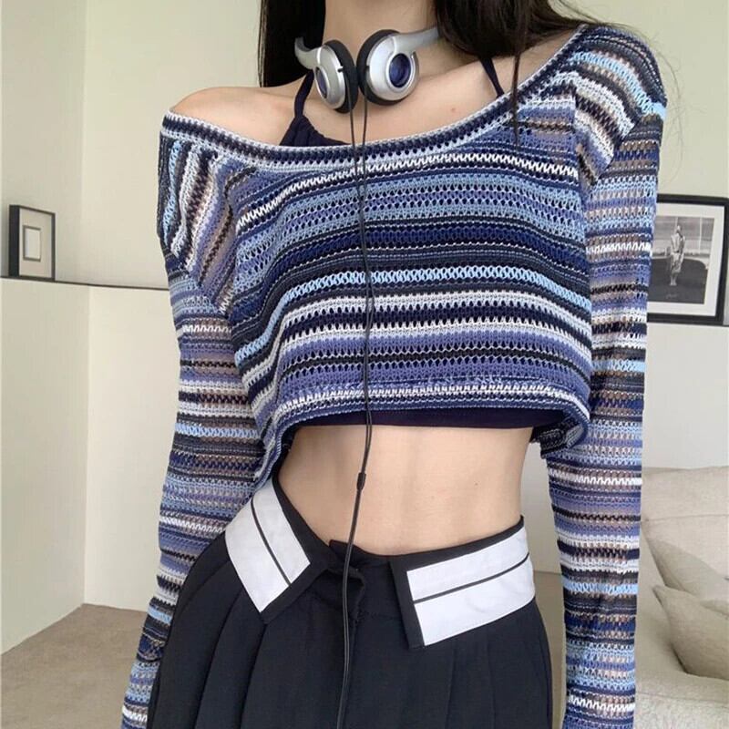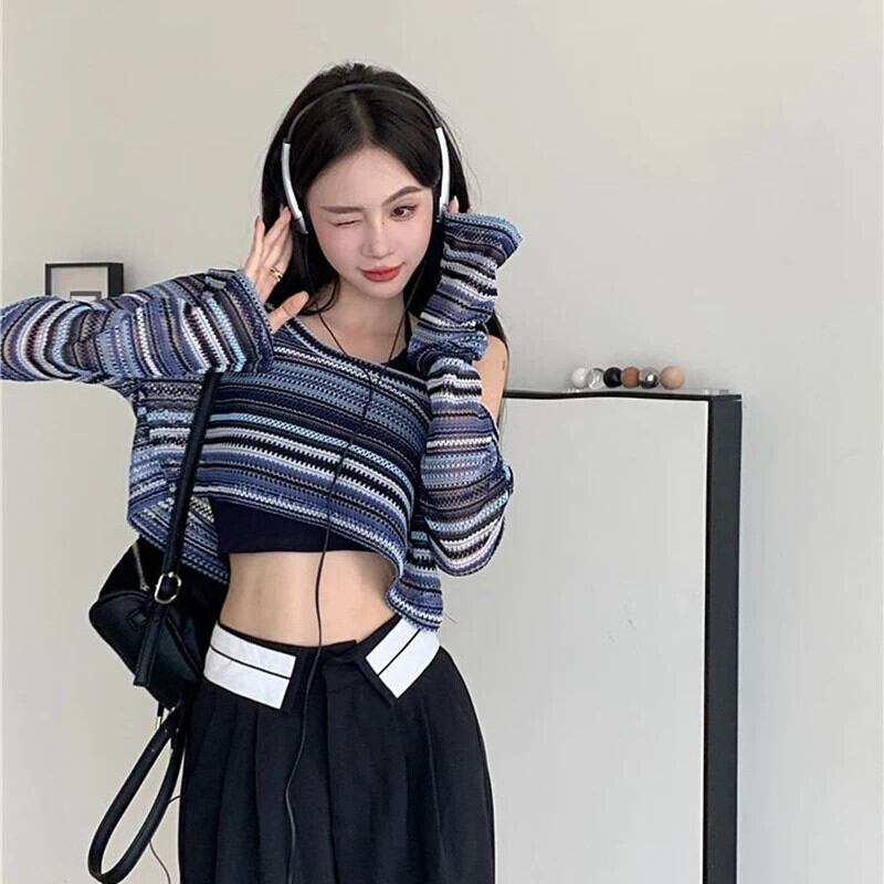 送料無料 Gidyq 夏の女性のセクシーなクロップド Tシャツストライプ中空長袖トップス Y2K ストリートすべて一致ニットウェア ロング サマー 夏物 AE008077661016229937
