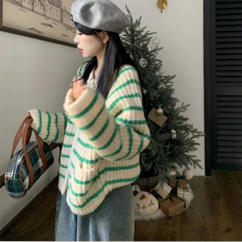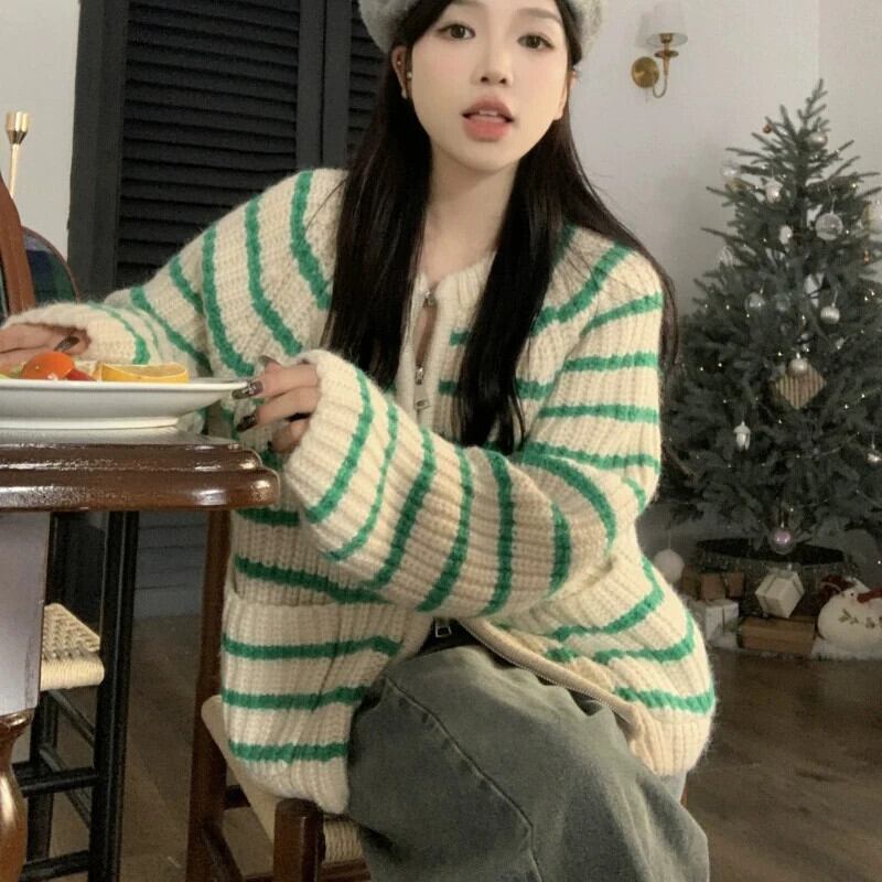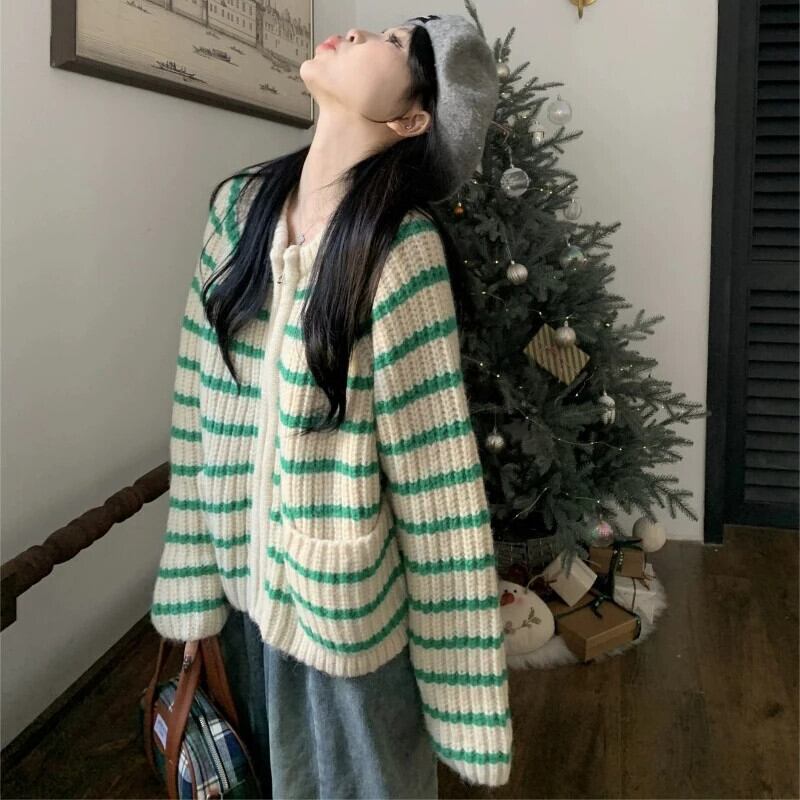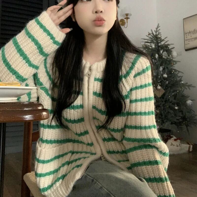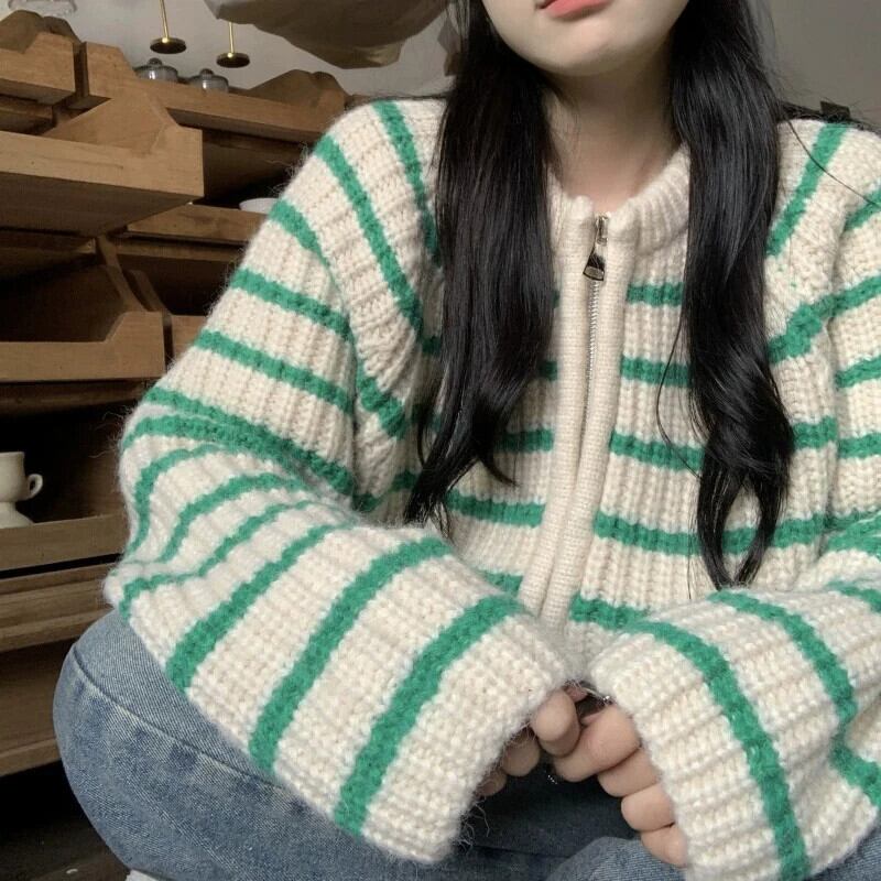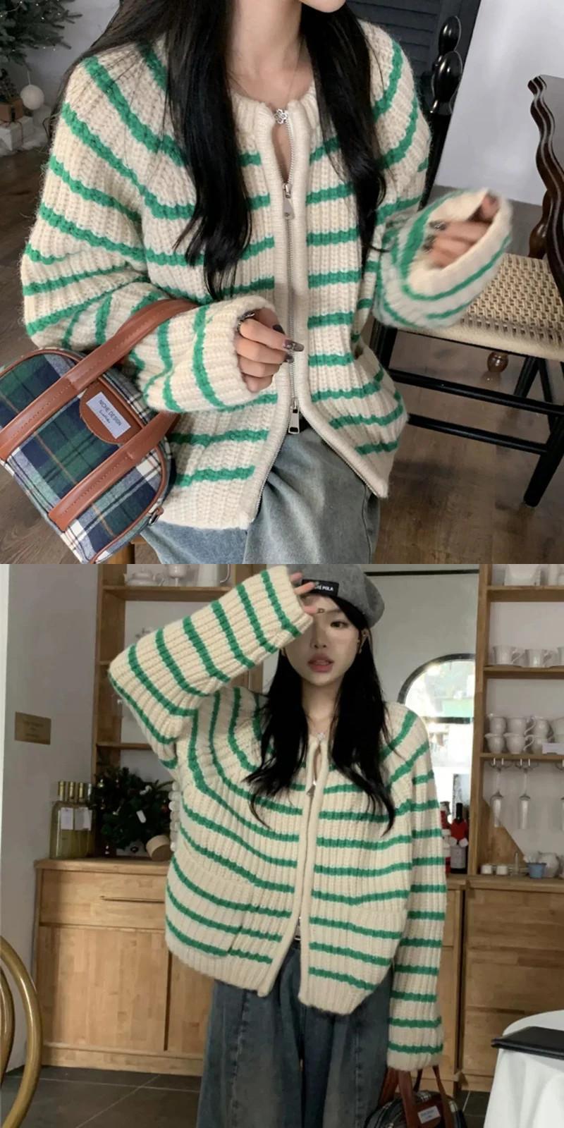 送料無料 Gidyq ダブルジップカーディガンセーター秋の女性のストライプルーズニットコートストリートジャケット オータム 秋物 AE00807766933378171