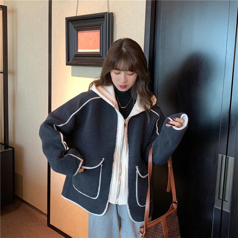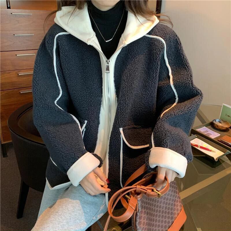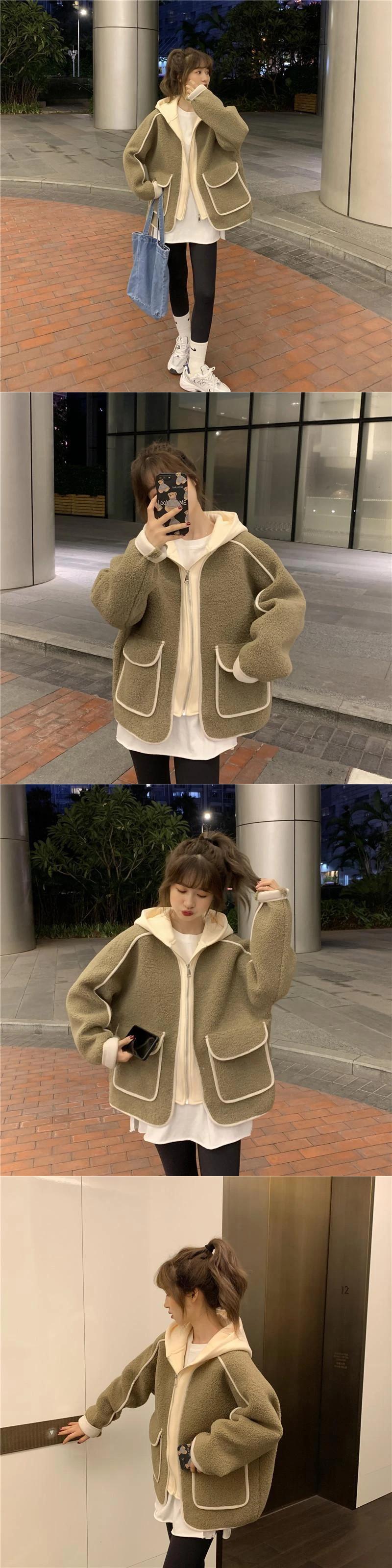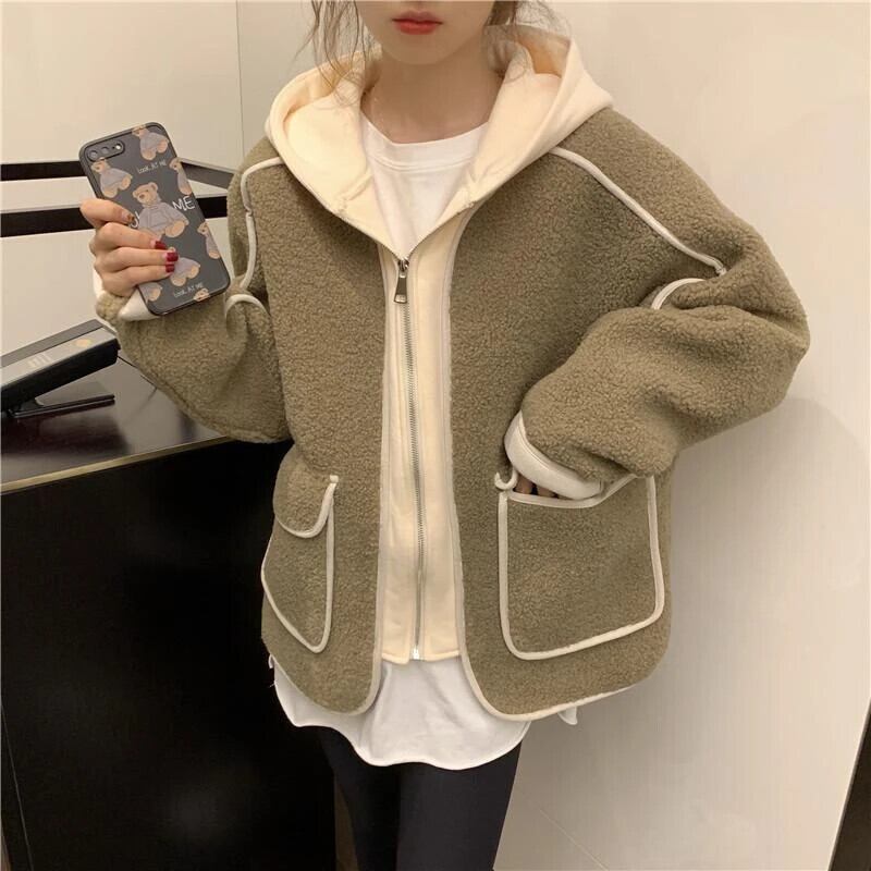 送料無料 Gidyq 女性パッチワークラムウールジャケットストリートパーカーコート秋すべて一致厚く暖かい生き抜く オータム 秋物 AE008077659990012994