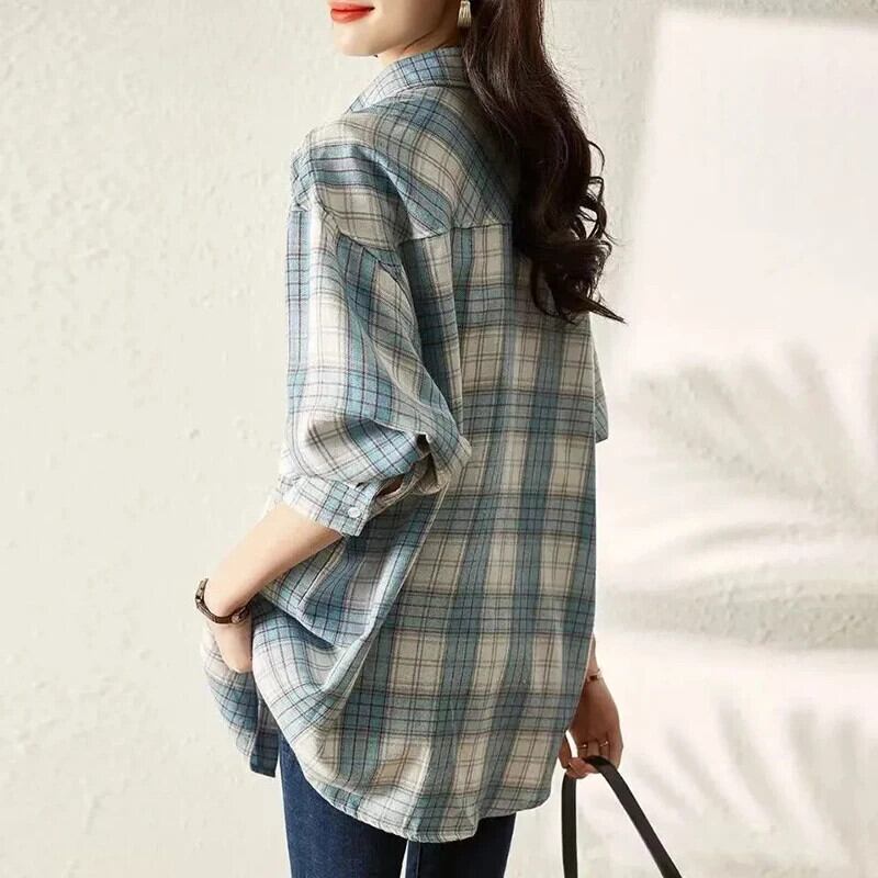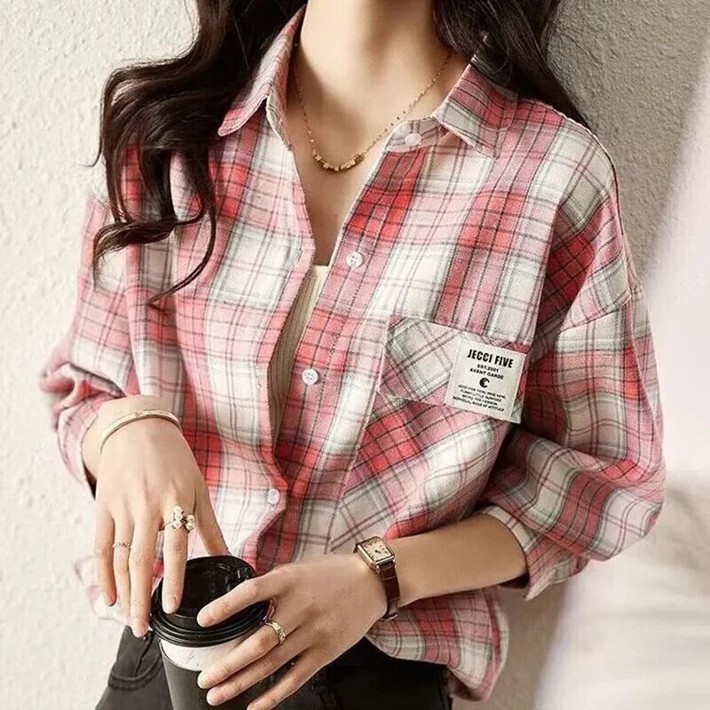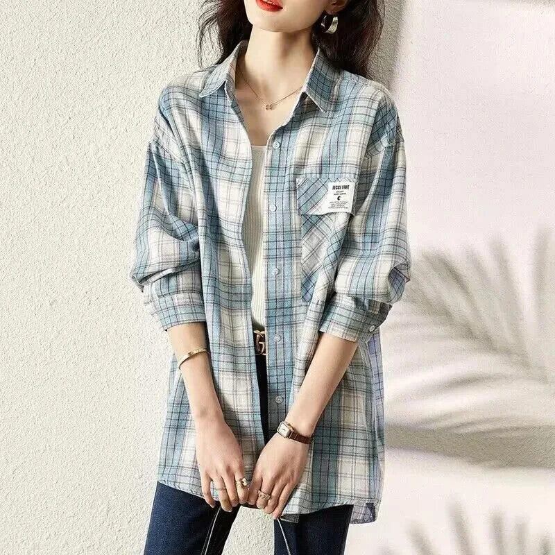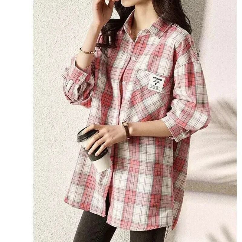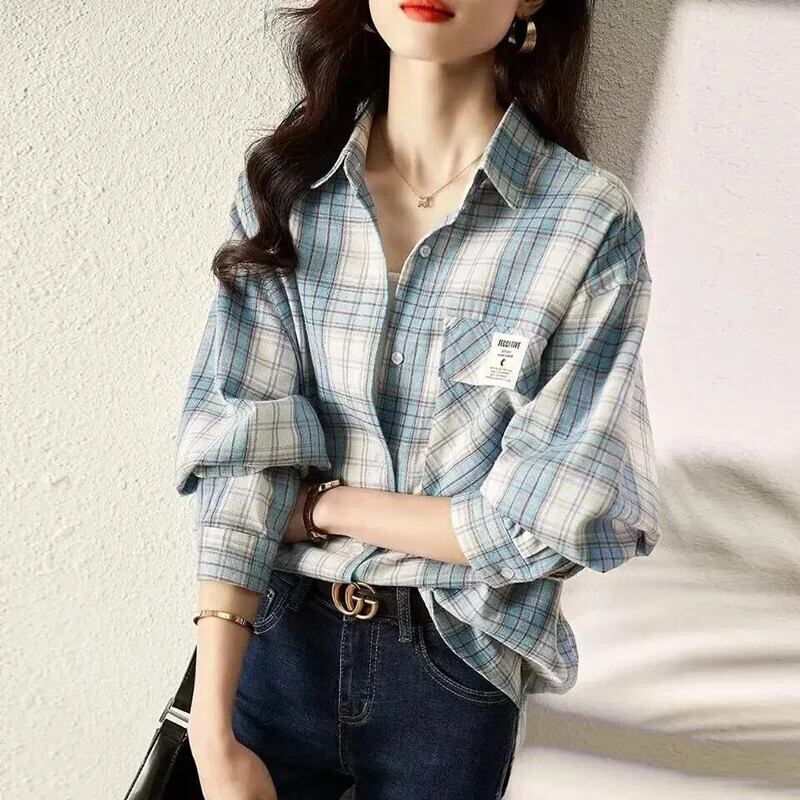 送料無料 Gidyq 女性チェック柄シャツストリートボタン長袖トップスすべて一致ルーズシャツ春 ロング スプリング 春物 AE008077686544741175