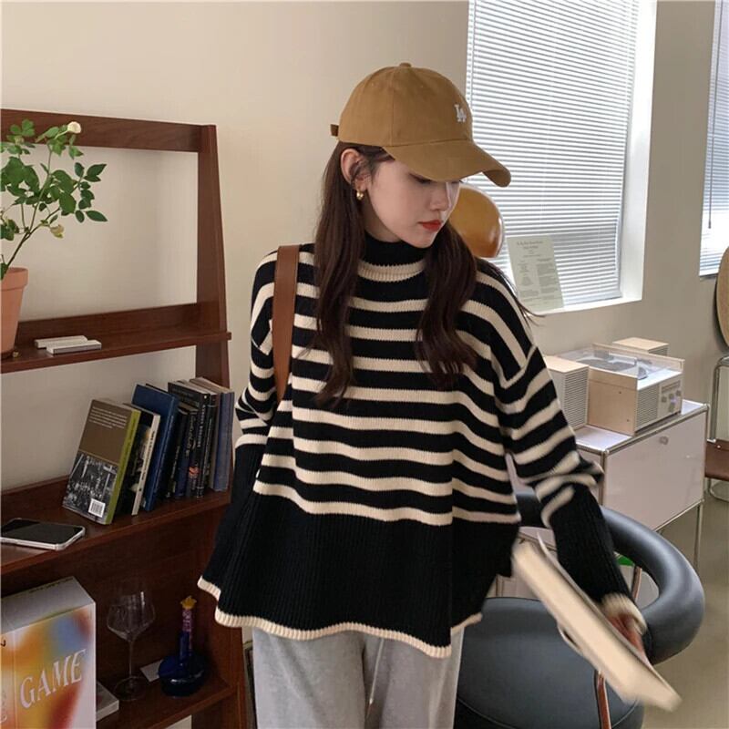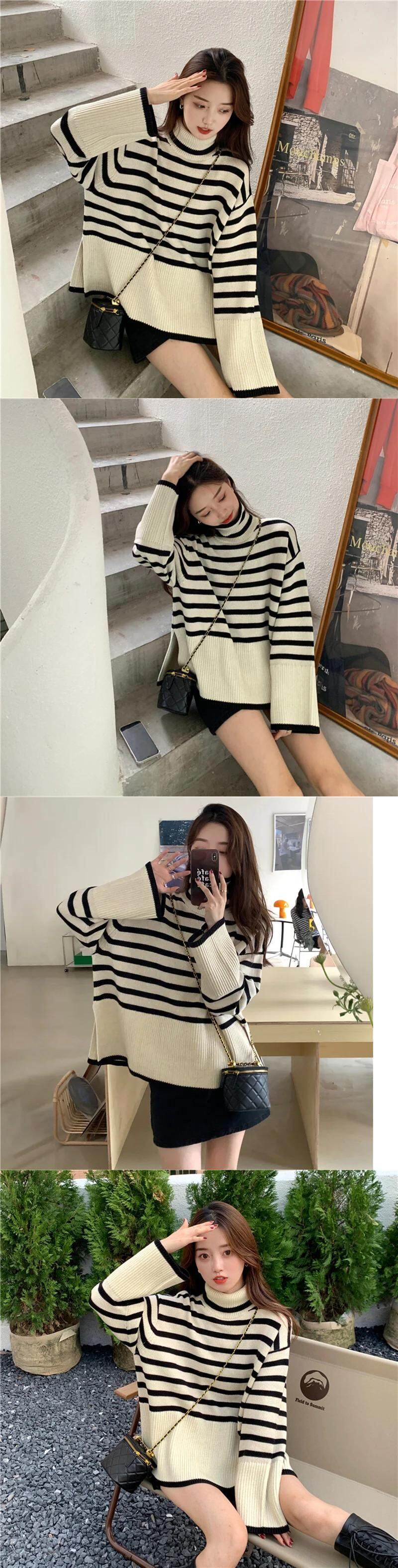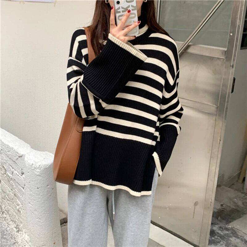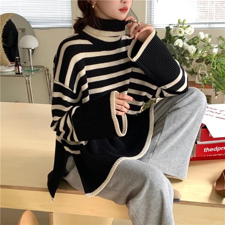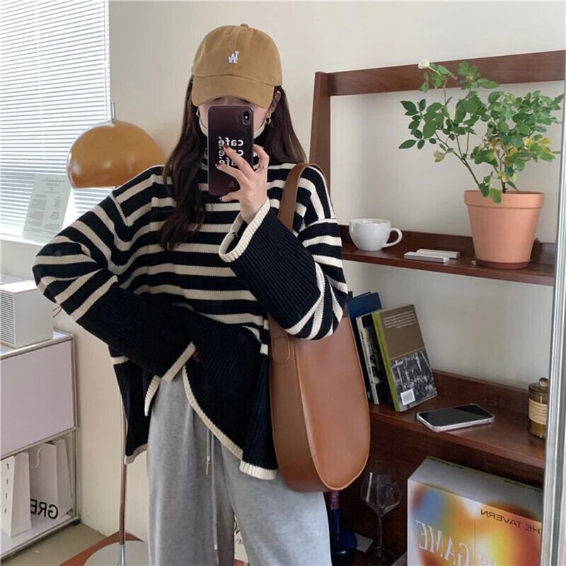 送料無料 Gidyq 女性スリットニットセーター秋ストライプルーズ長袖ジャンパーストリートプルオーバー ロング オータム 秋物 AE008077699581667836