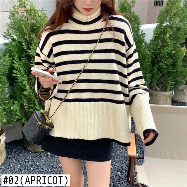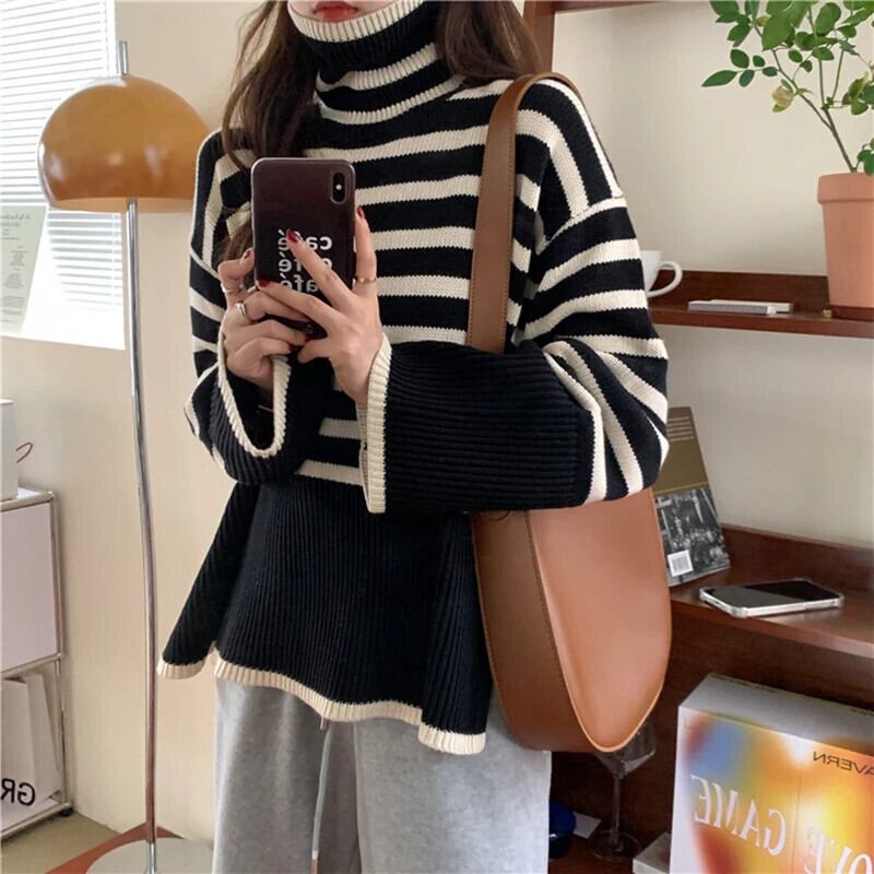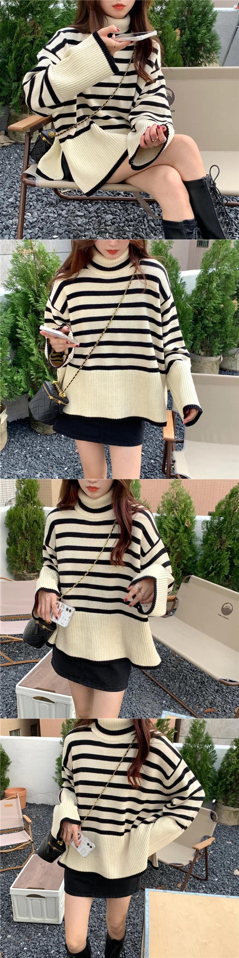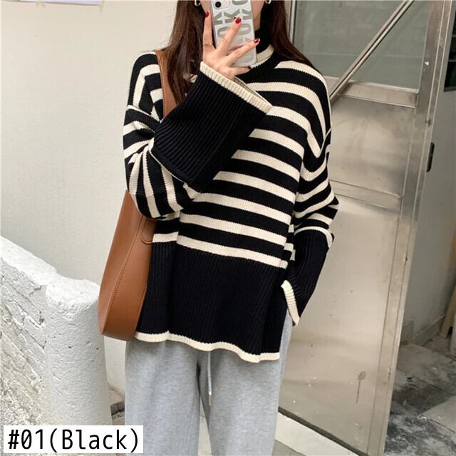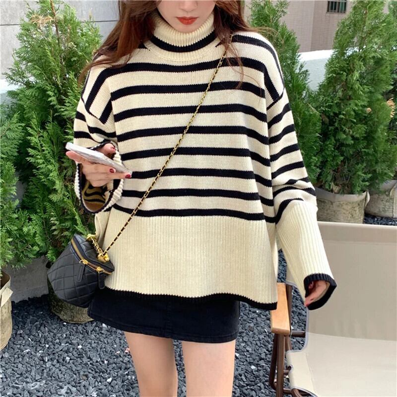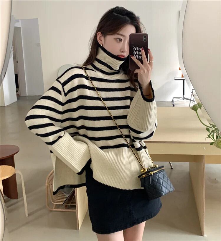 送料無料 Gidyq 女性スリットニットセーター秋ストライプルーズ長袖ジャンパーストリートプルオーバー ロング オータム 秋物 AE008077699581667836