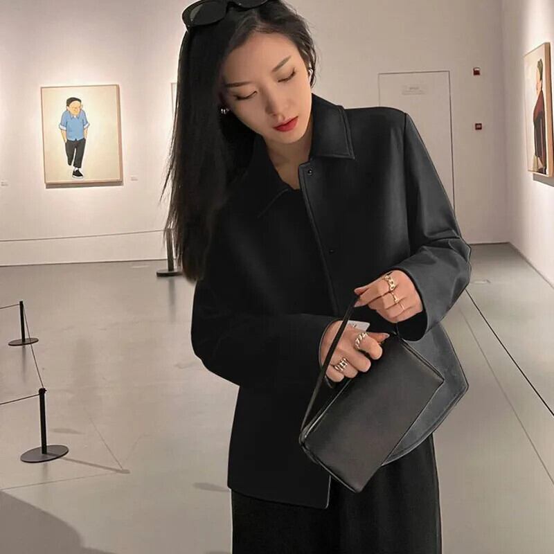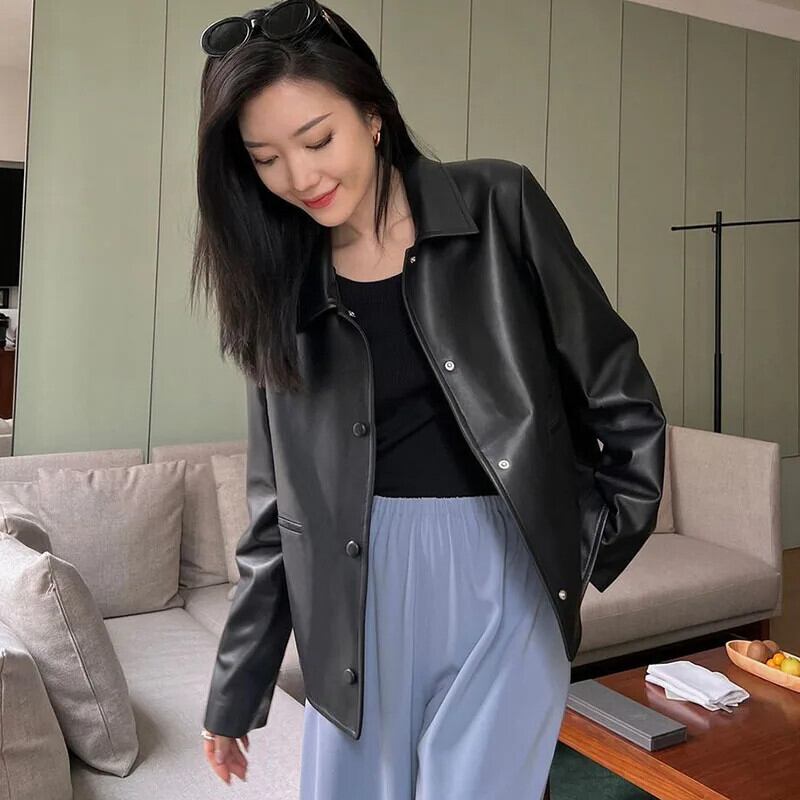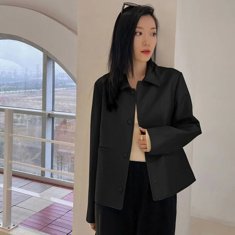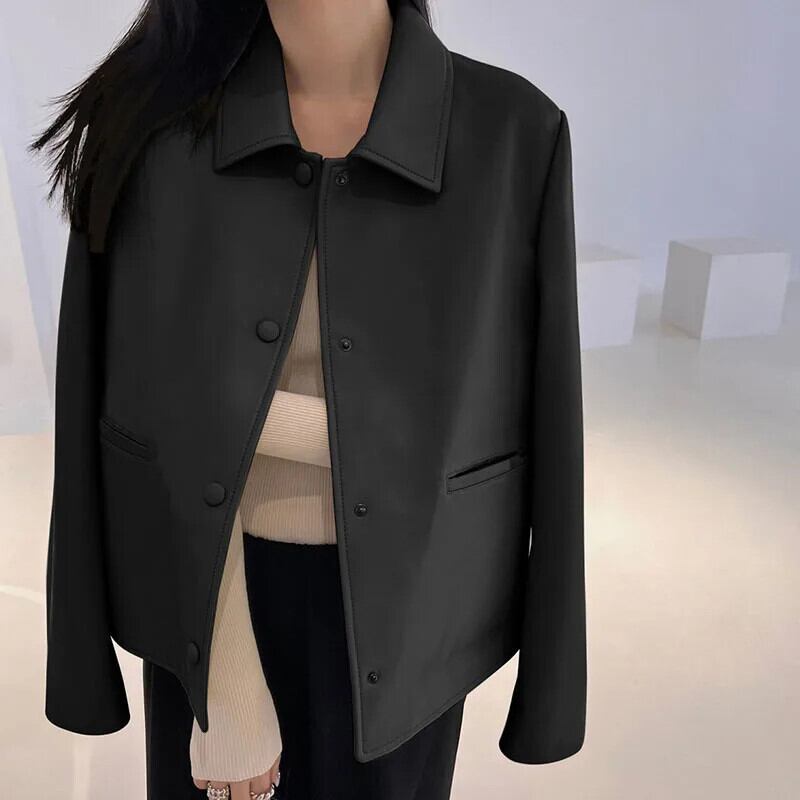 送料無料 Gidyq 女性レザージャケットストリートルーズコートすべて一致ボタンソリッドブラックアウターウェア秋 オータム 秋物 ソリッドカラー AE008077675942492513