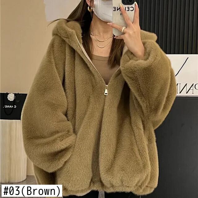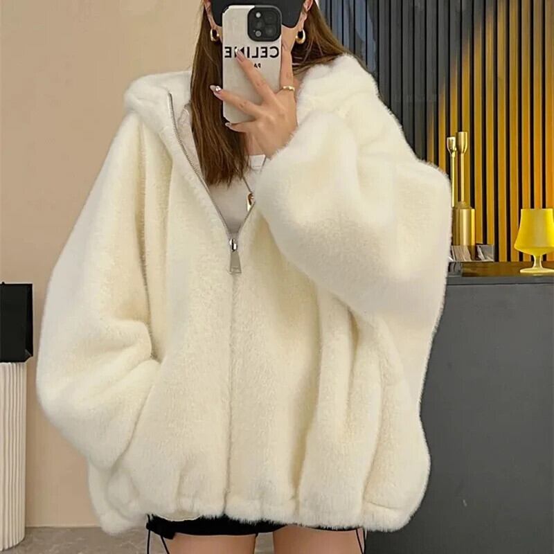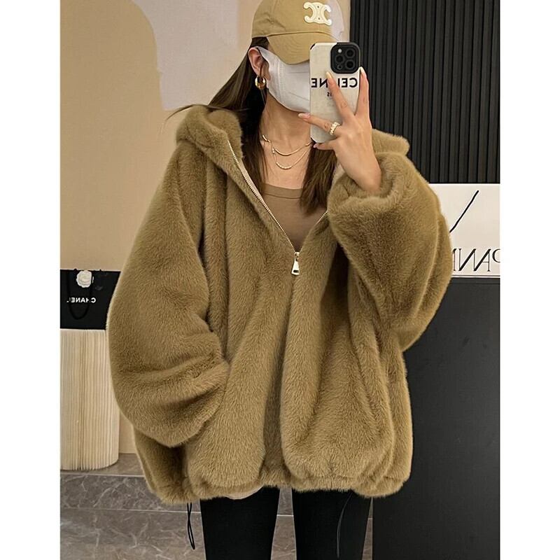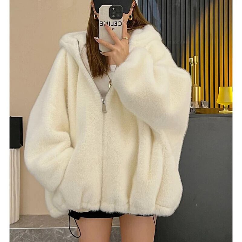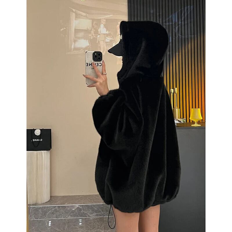 送料無料 Gidyq 女性ウサギの毛皮のコート冬のストリートぬいぐるみフード付きジャケット厚く暖かいパーティールーズオーバーコート ウィンター 冬物 AE008077612791803541