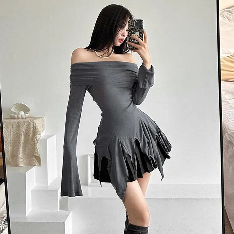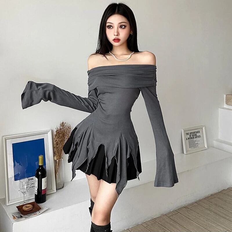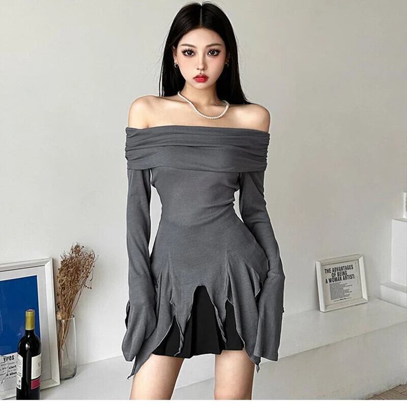 送料無料 Gidyq ストリート女性 Tシャツ不規則なスリム長袖トップスアメリカンスタイルすべて一致オフショルダー Tシャツ ロング AE008077635489136074