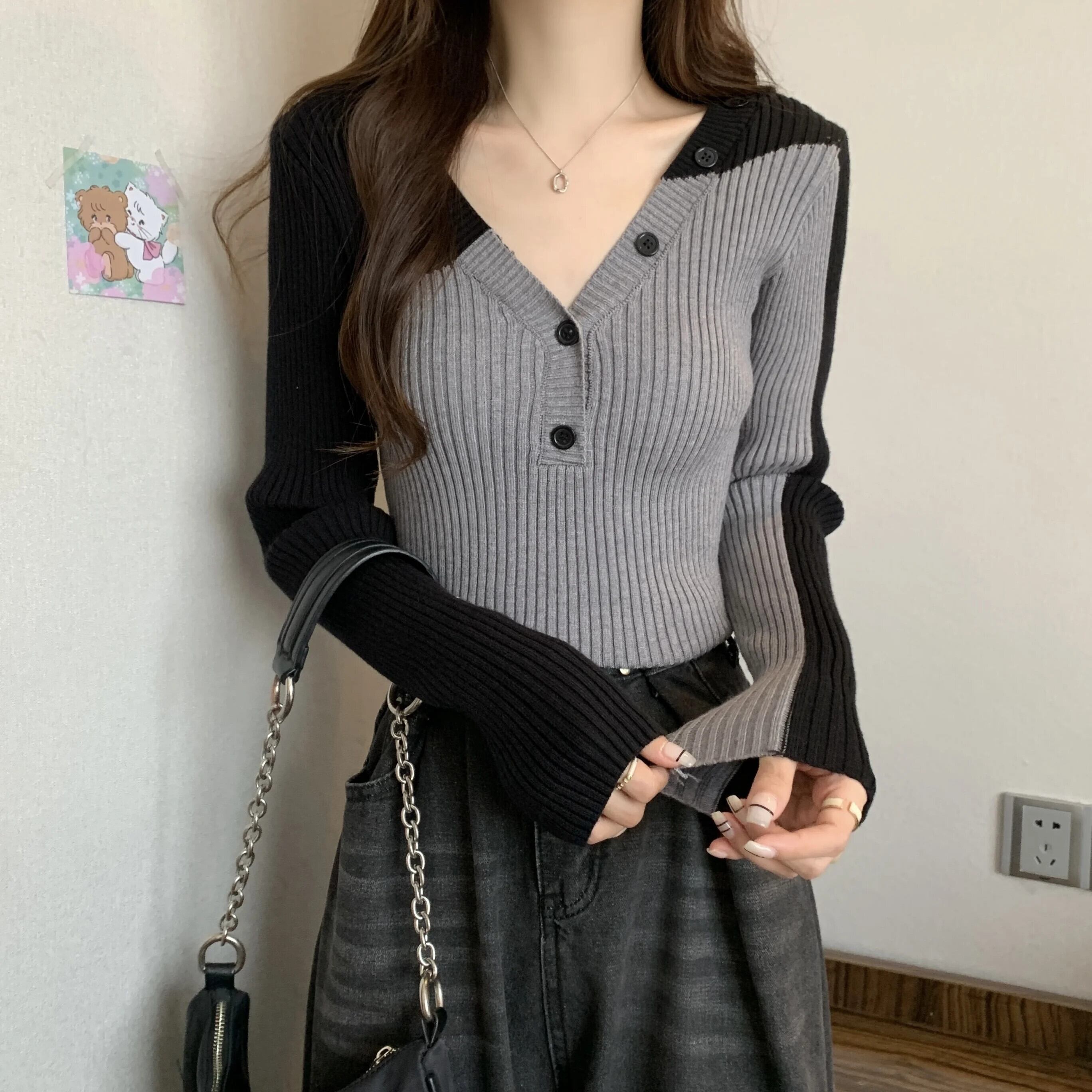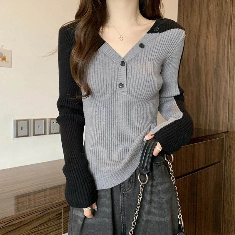 送料無料 Gidyq 女性パッチワークセーターストリートウォームフィットニット原宿すべて一致ボタン長袖トップス ロング かわいい AE008077618630191431