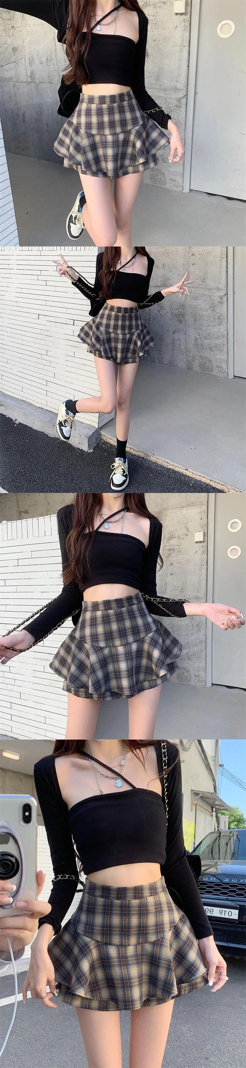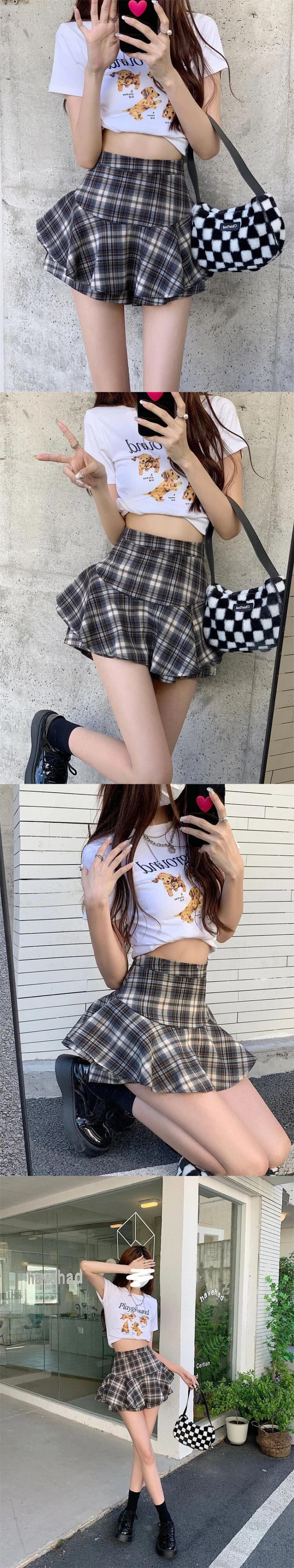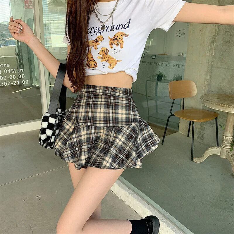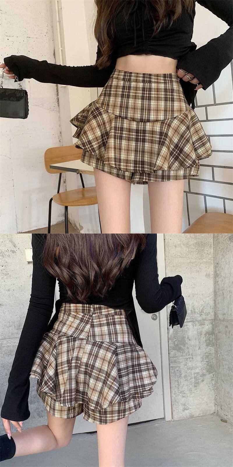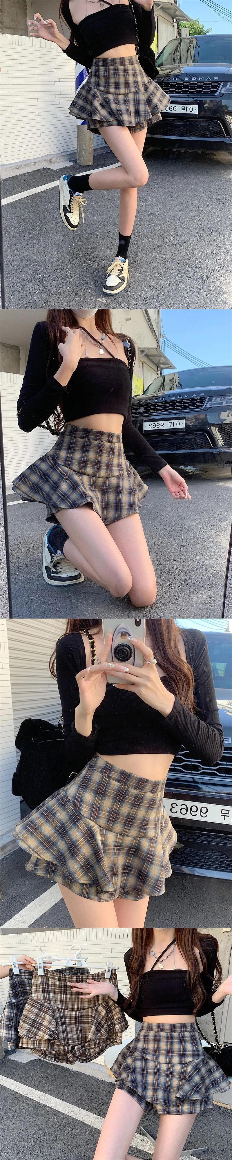 送料無料 Gidyq 不規則なチェック柄ミニスカート女性レトロフリルスカートショート Y2K ウエスト A ライン裏地スカート ラッフル Aライン AE008077692293277104