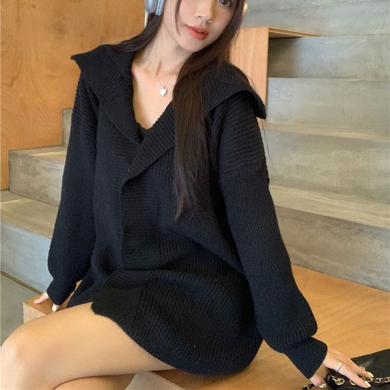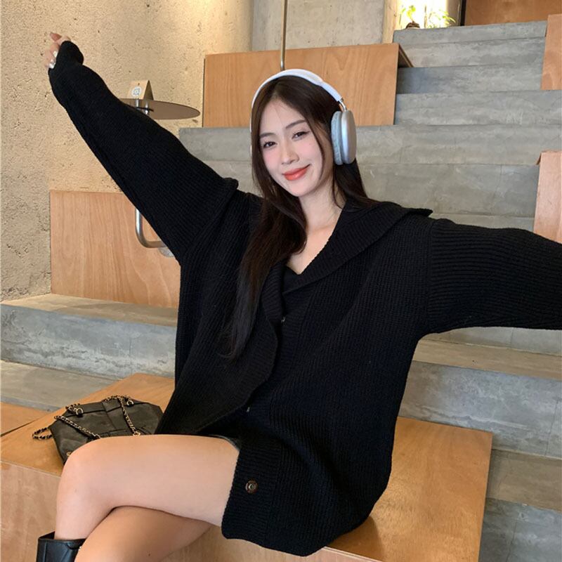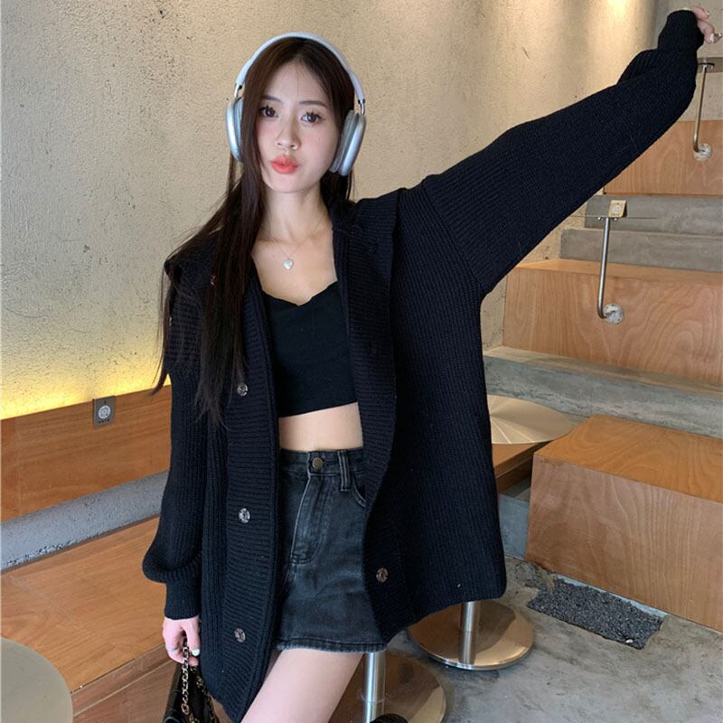 送料無料 Gidyq 女性カーディガンセーターストリートブラックルーズニットコートすべて一致ジャケット秋 オータム 秋物 AE008077666707424711