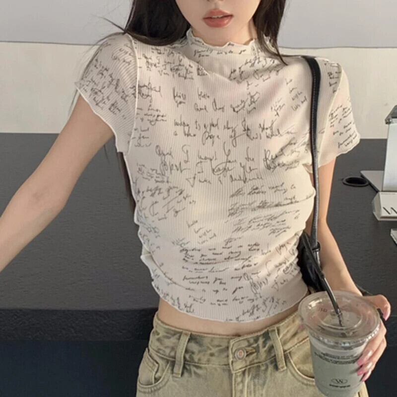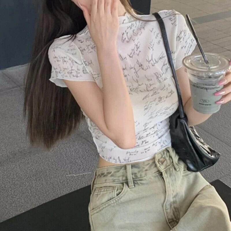 送料無料 Gidyq 女性レタープリント Tシャツ夏のストリート半袖トップス Y2K セクシーな半薄手のクロップ Tシャツ ショート ハーフスリーブ サマー 夏物 AE008077677283143011