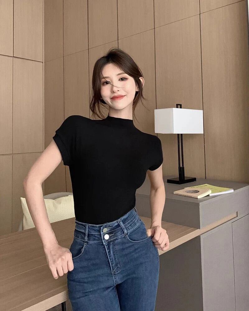 送料無料 Gldyq 女性スリムスタンドカラー白 Tシャツわずかに弾性ソリッドカラー Tシャツホットガールタイトトップス夏 ホワイト エラスティック 伸縮 サマー 夏物 AE008077669725631603