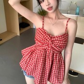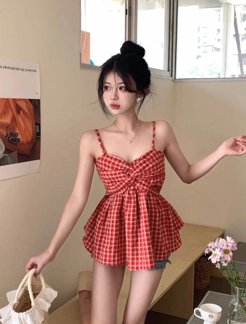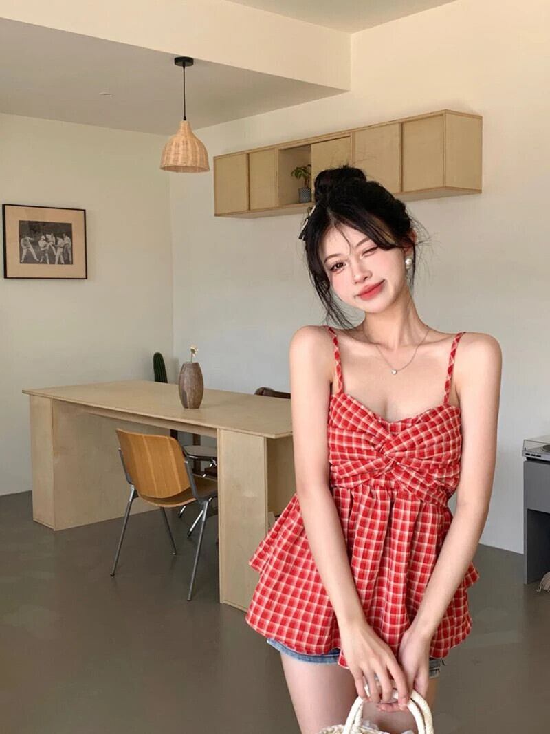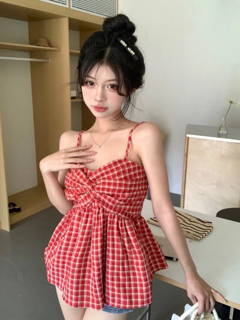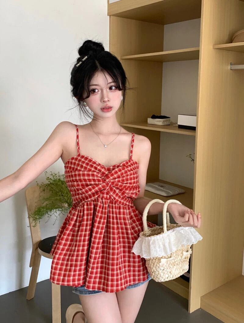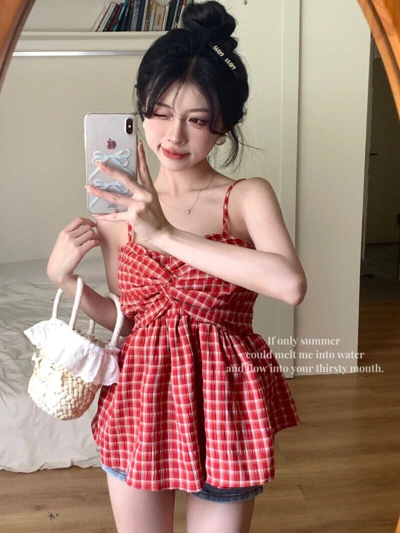 送料無料 Gidyq 甘いチェック柄スパゲッティストラップタンク女性のセクシーな弓ノースリーブタンク夏原宿ストリートショートトップス リボン 大人ガーリー スウィート キュート カジュアル かわいい サマー 夏物 AE008077681496233401