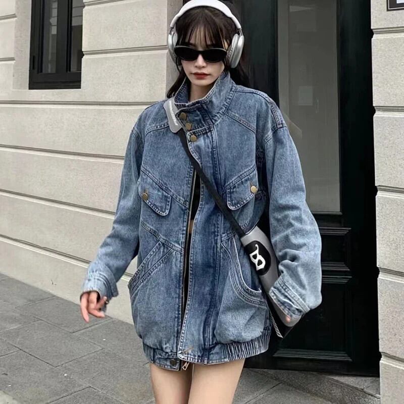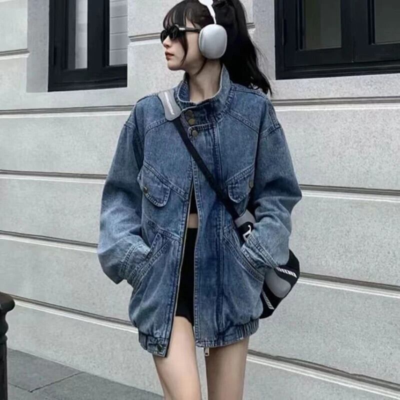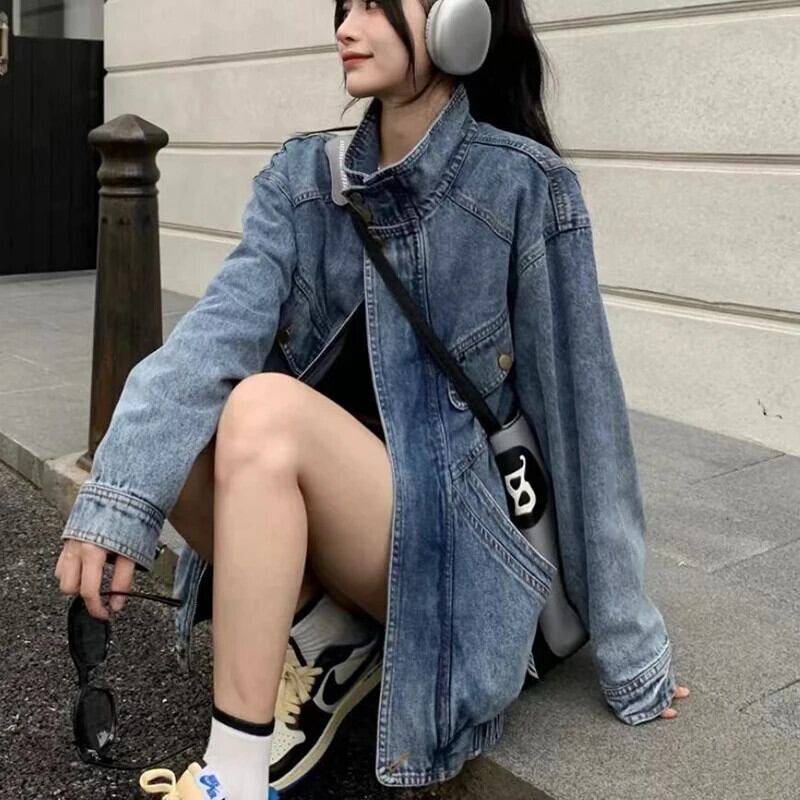 送料無料 Gidyq 女性デニムジャケットアメリカンスタイルレトロ BF ルーズ長袖コート秋ストリートポケット生き抜く ロング オータム 秋物 AE008077622660953265