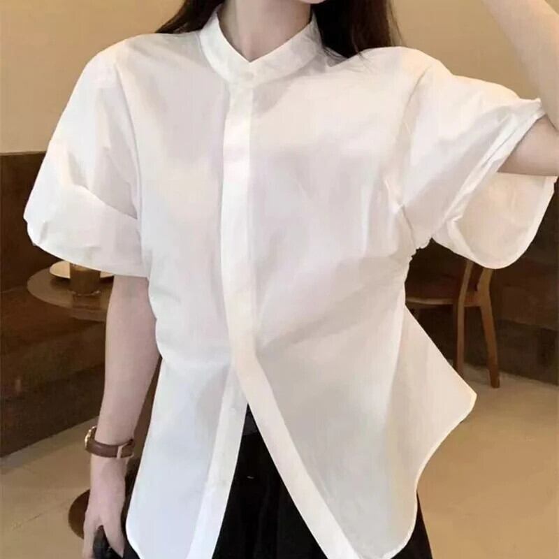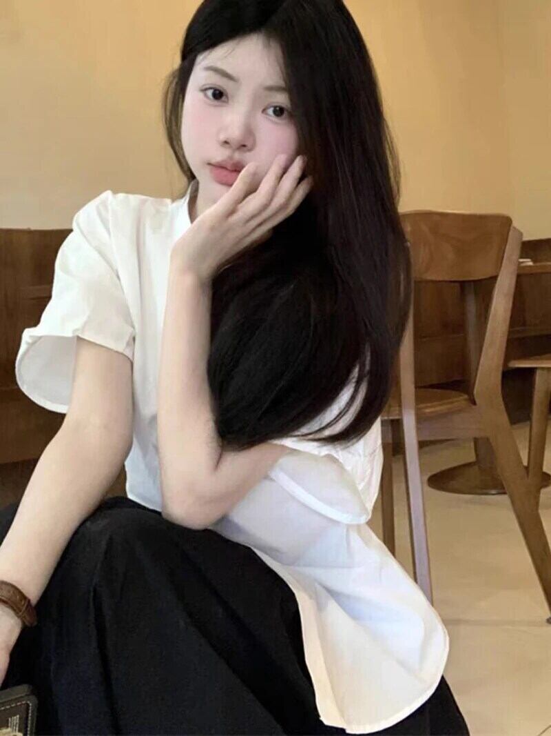 送料無料 Gidyq 綿 100% 白シャツ女性フレンチパフスリーブスリムフィットシャツ夏甘いプレッピースタイルソリッドトップ ホワイト コットン 大人ガーリー スウィート キュート カジュアル サマー 夏物 ソリッドカラー AE008077650560858687