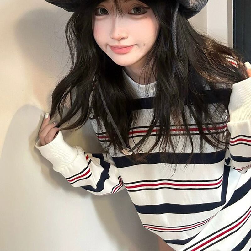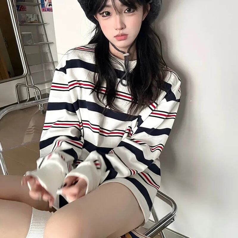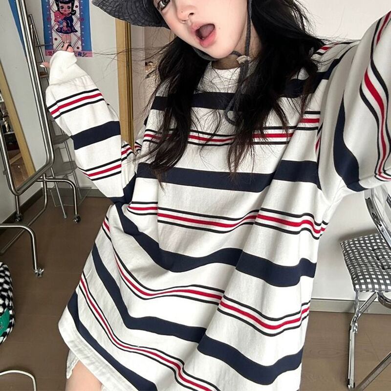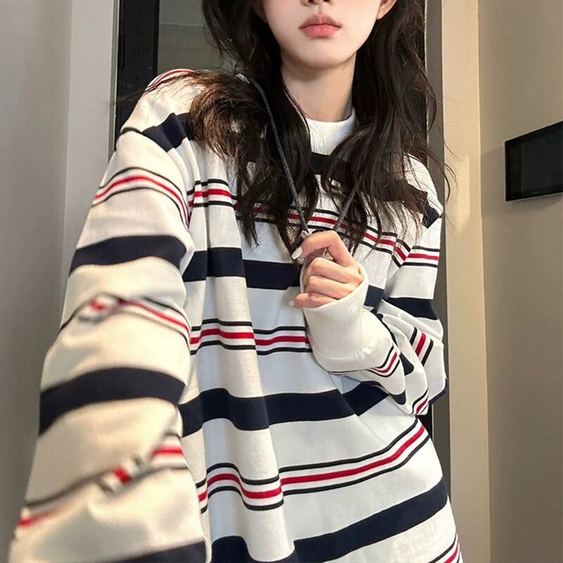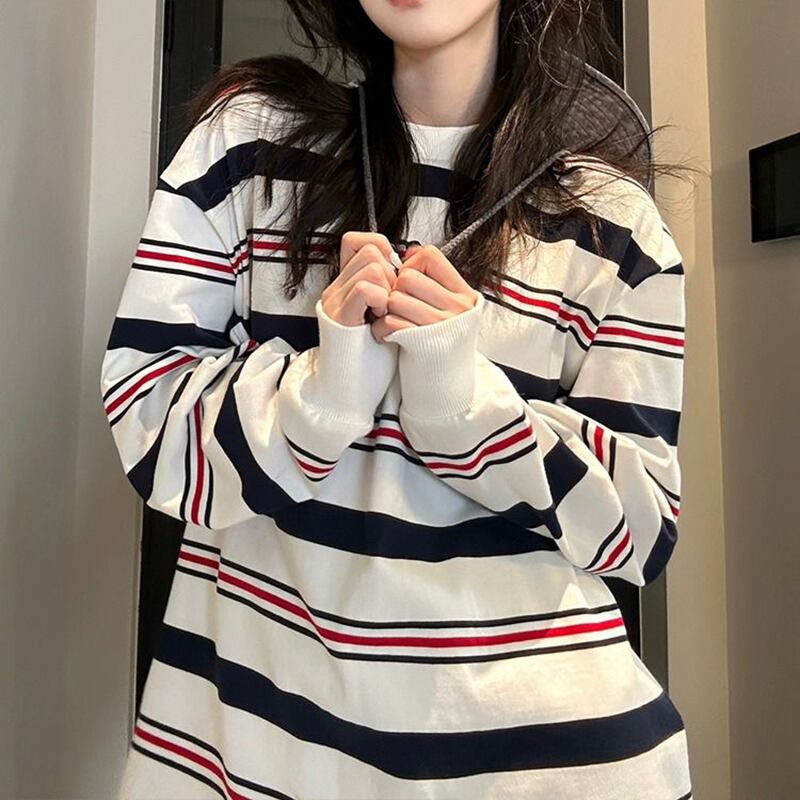 送料無料 Gidyq 春の女性のストライプ Tシャツストリートルーズトップスプレッピースタイルすべて一致学生 Tシャツ スプリング 春物 AE008077621010439483