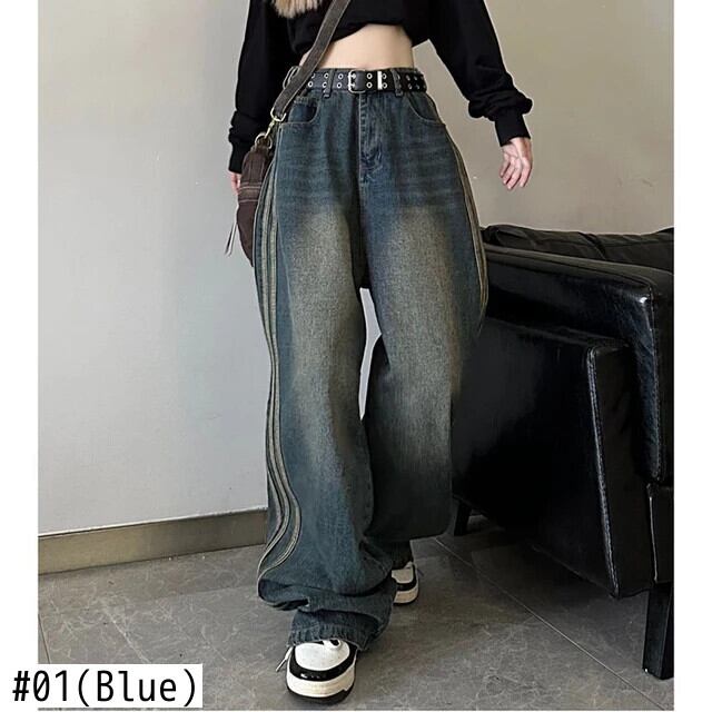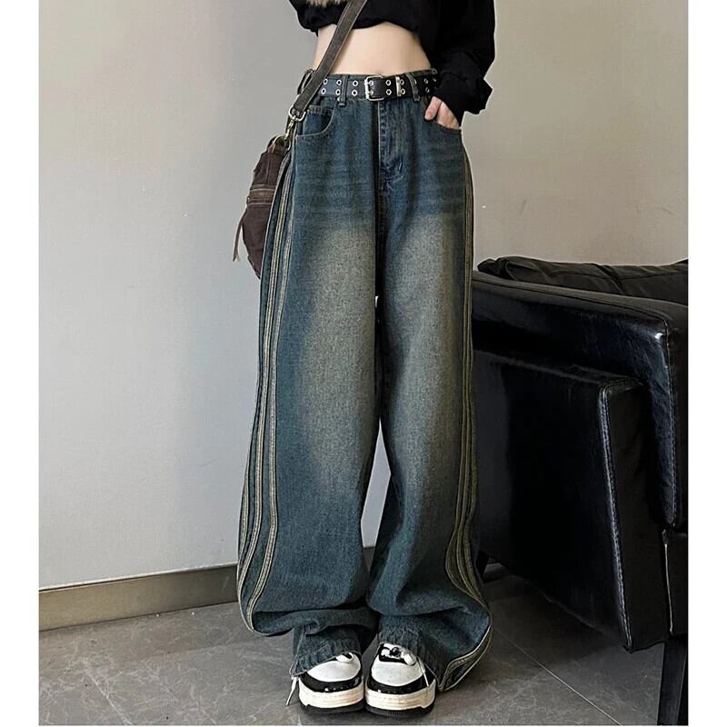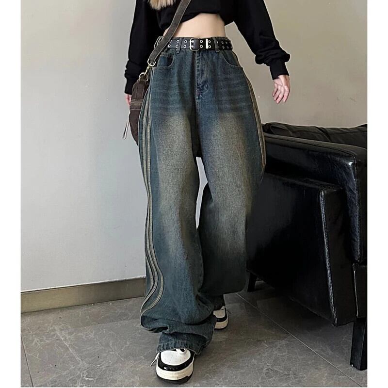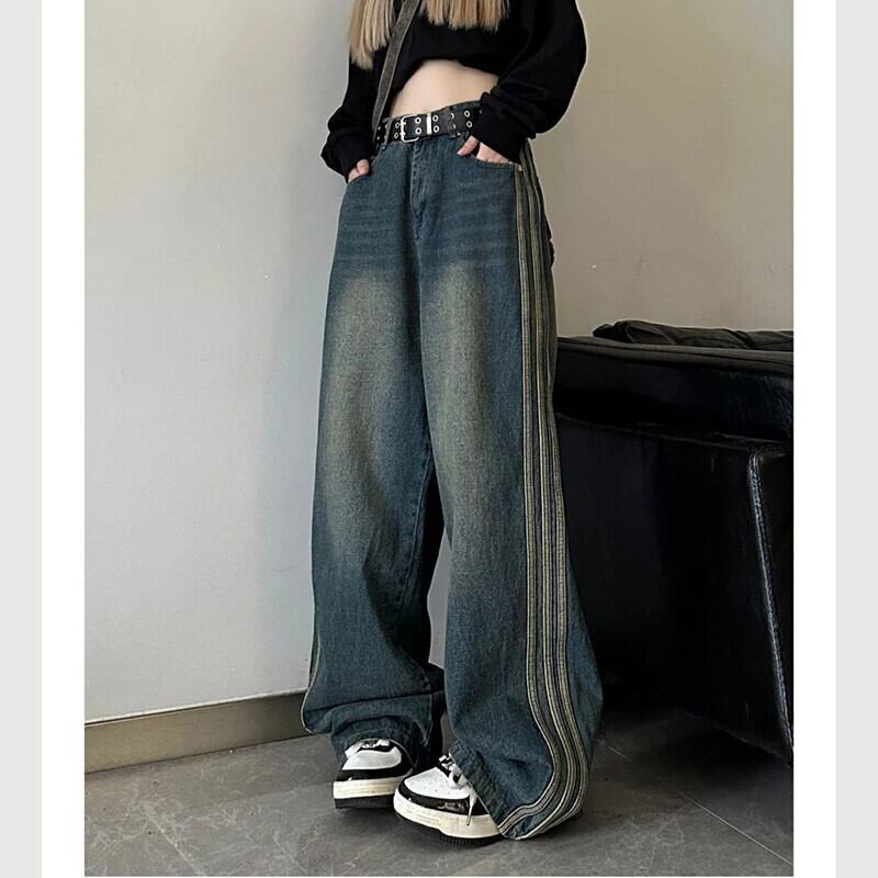 送料無料 Gidyq ウエスト女性ジーンズストライプストリートルーズワイドレッグパンツすべて一致デニムパンツ秋 オータム 秋物 ワイドパンツ AE008077693586503093
