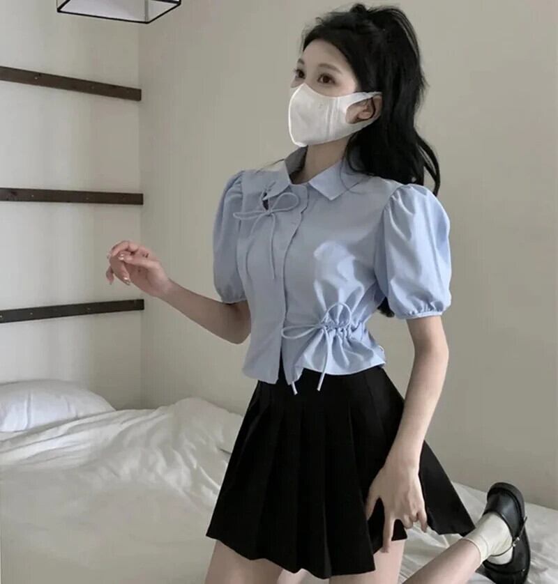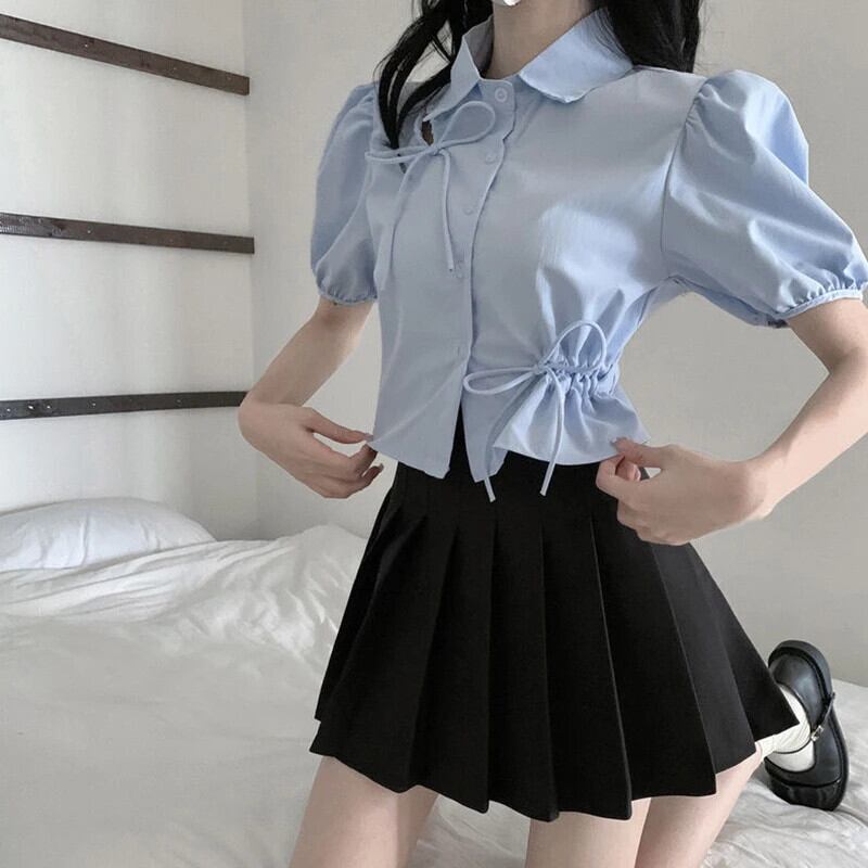 送料無料 Gidyq パフスリーブブルーシャツ女性弓ショートトップ夏シックな中空ソリッドオールマッチブラウス リボン サマー 夏物 ソリッドカラー AE008077647587432264